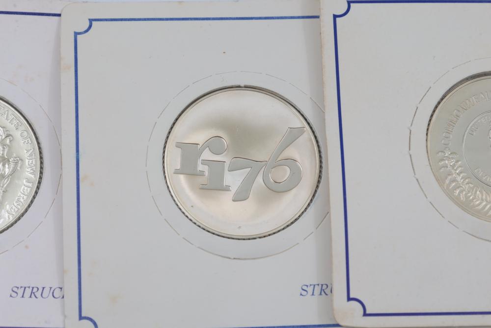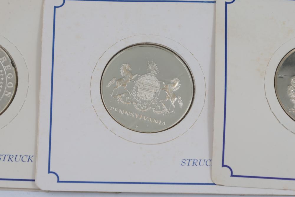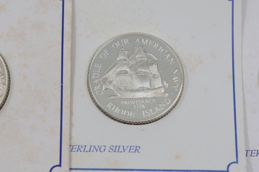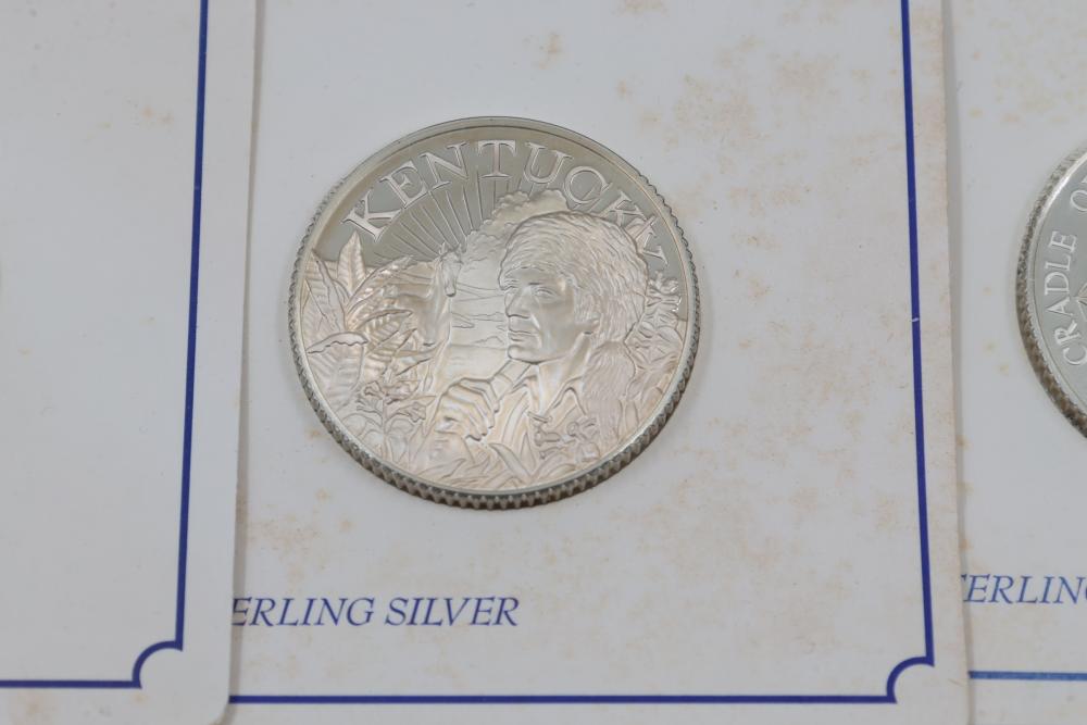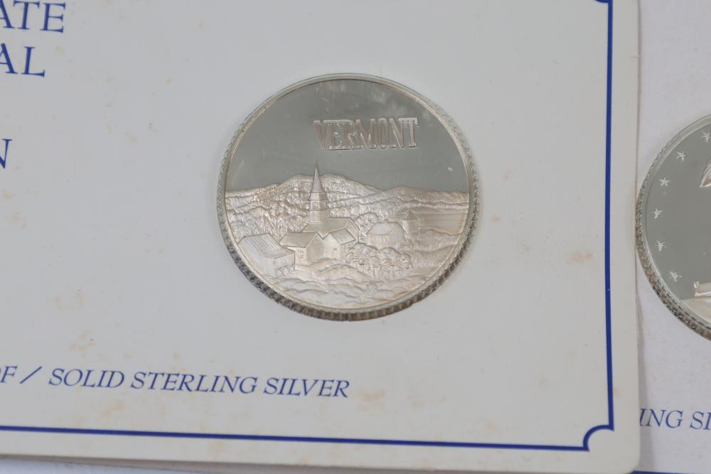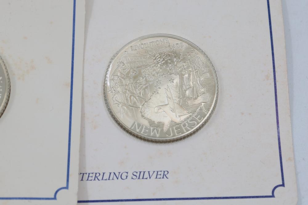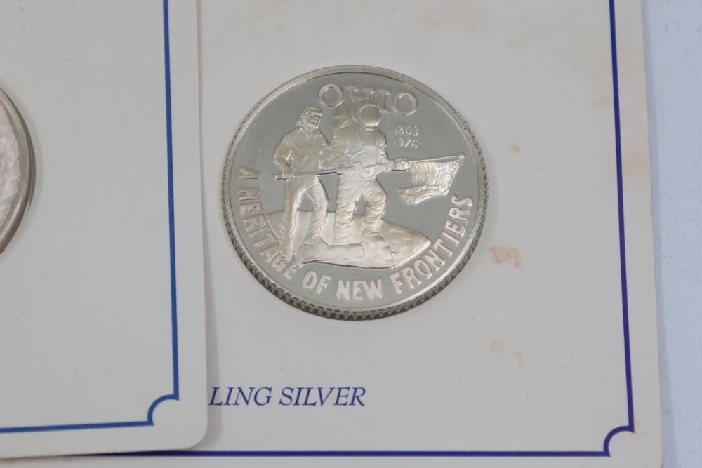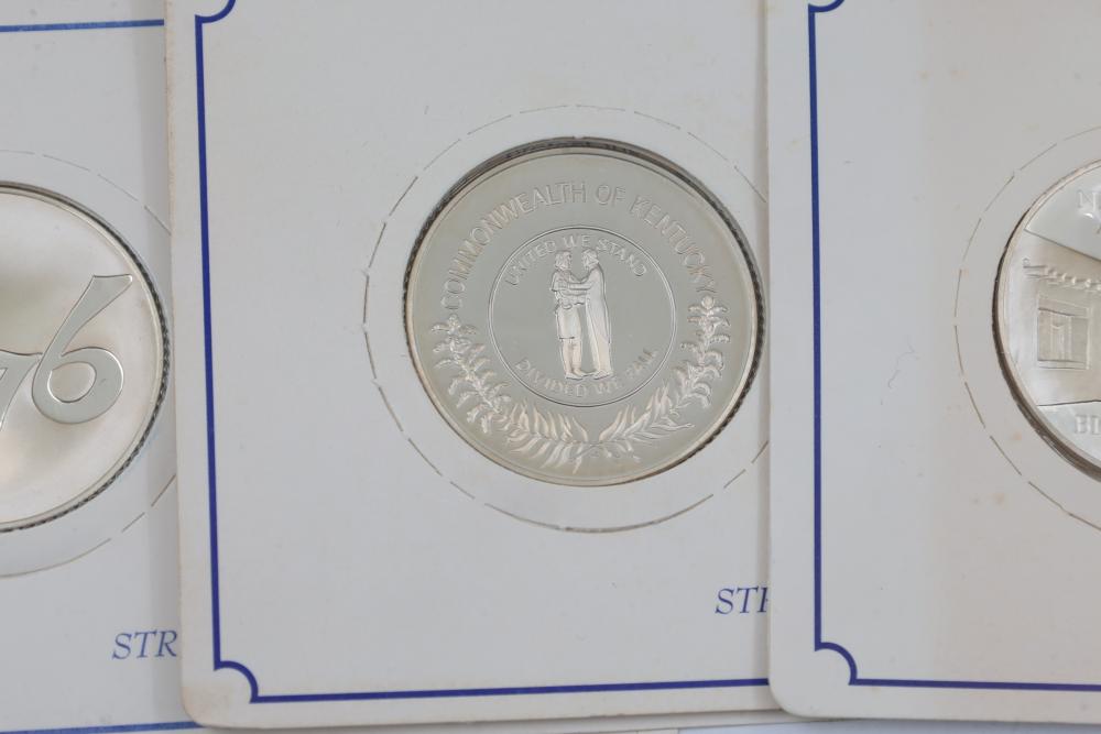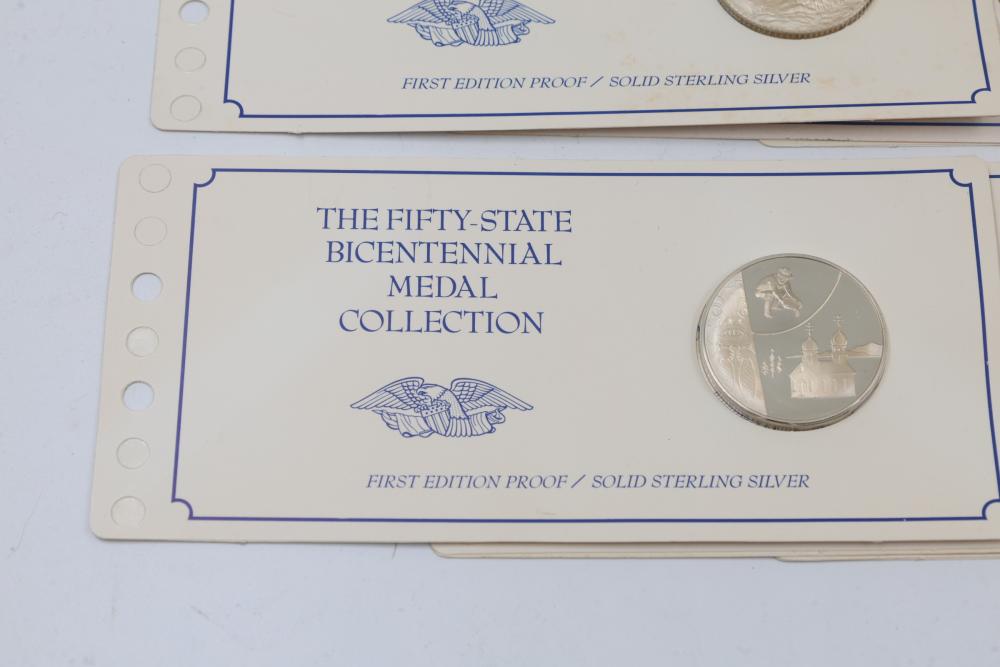 (10) Fifty Sterling Silver Bicentennial Medals. Each medal represents a U.S. state and is struck in solid sterling silver. The set is mounted in presentation cards. 10 coins total. Total weight being 320 grams. Each coin weighs approximately 32 grams.