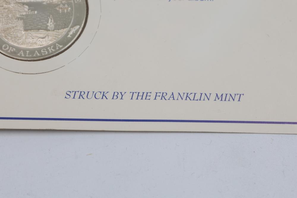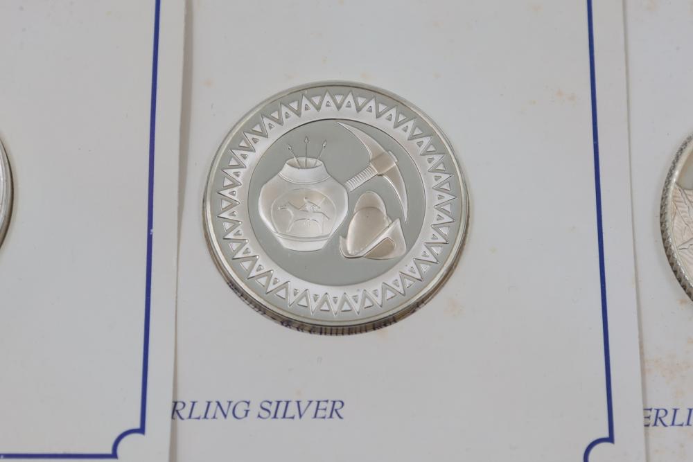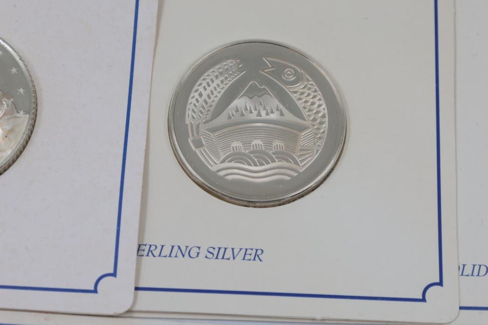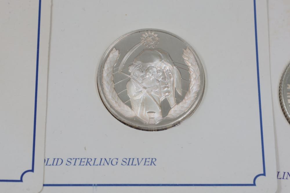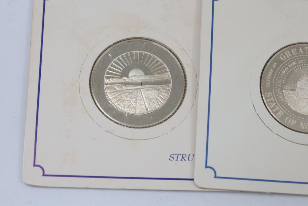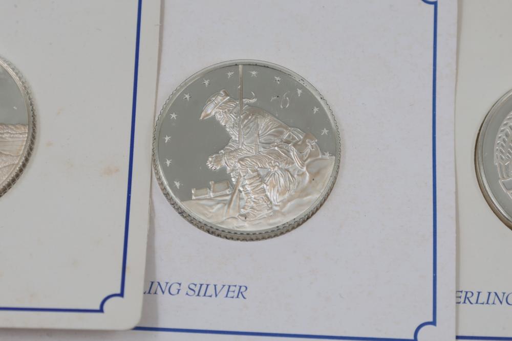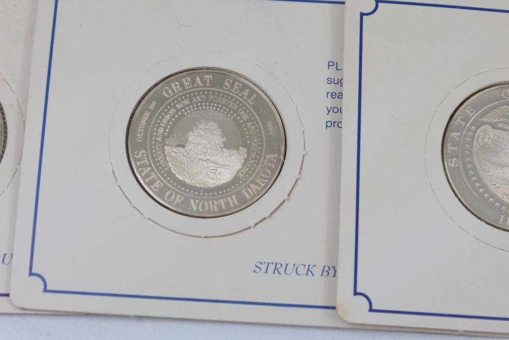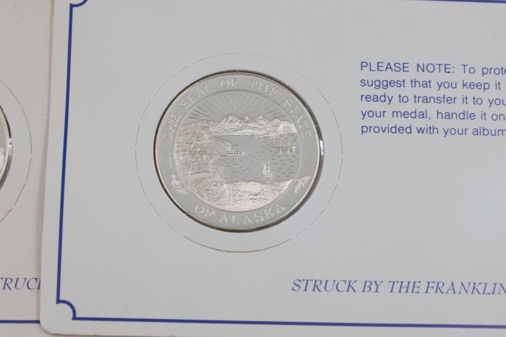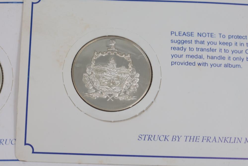 (10) Fifty Sterling Silver Bicentennial Medals. Each medal represents a U.S. state and is struck in solid sterling silver. The set is mounted in presentation cards. 10 coins total. Total weight being 320 grams. Each coin weighs approximately 32 grams.