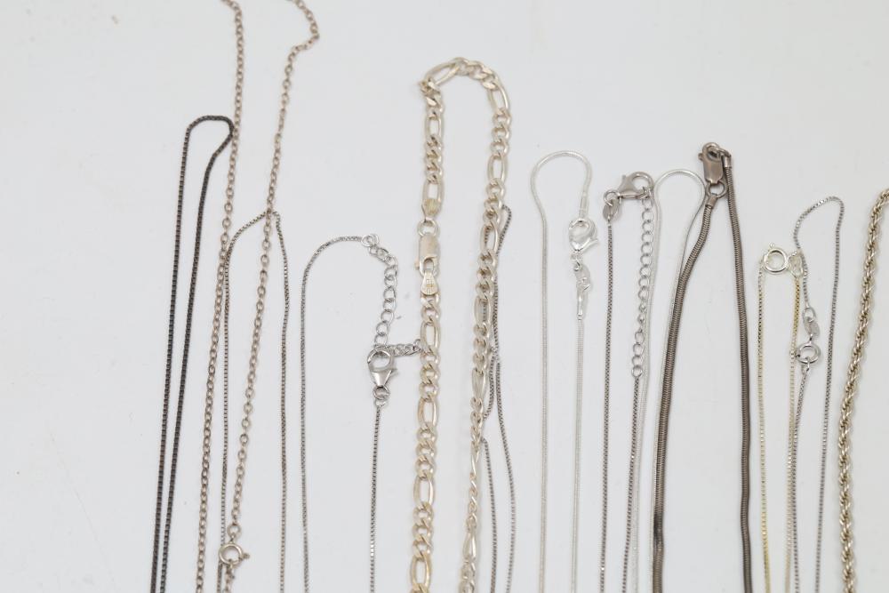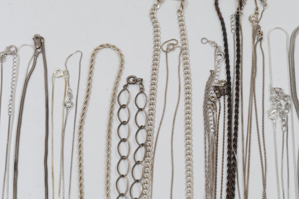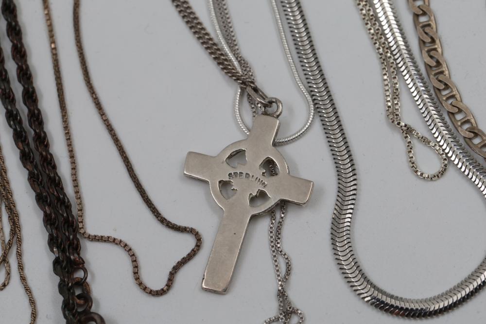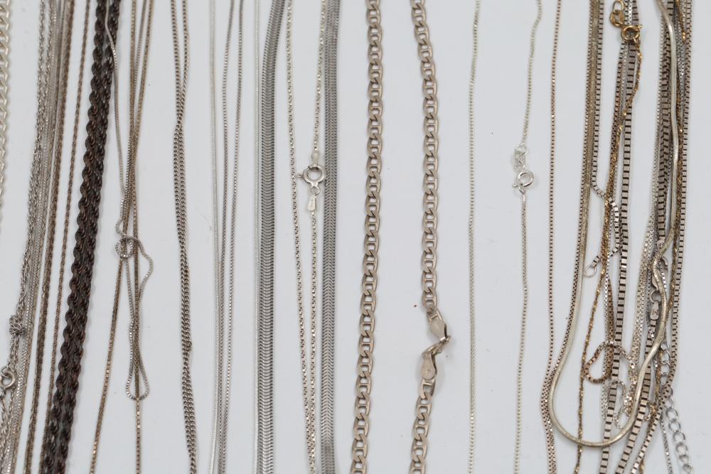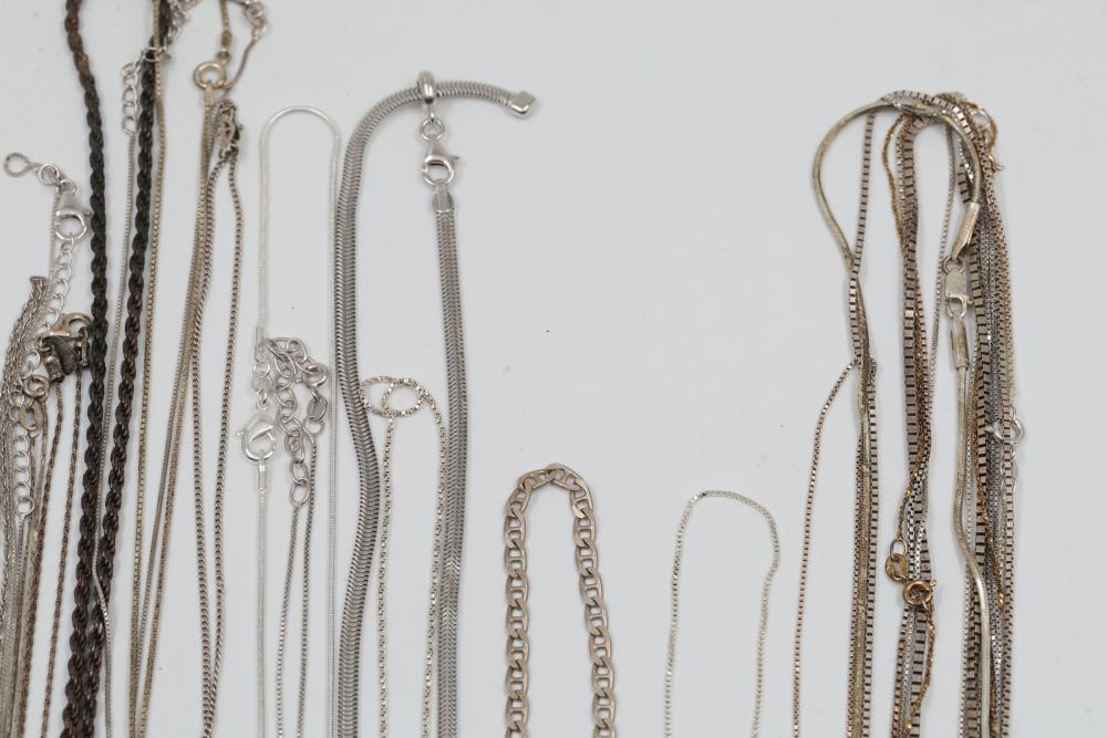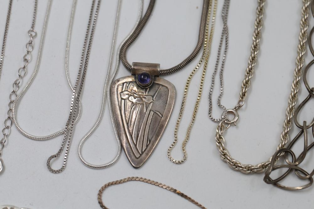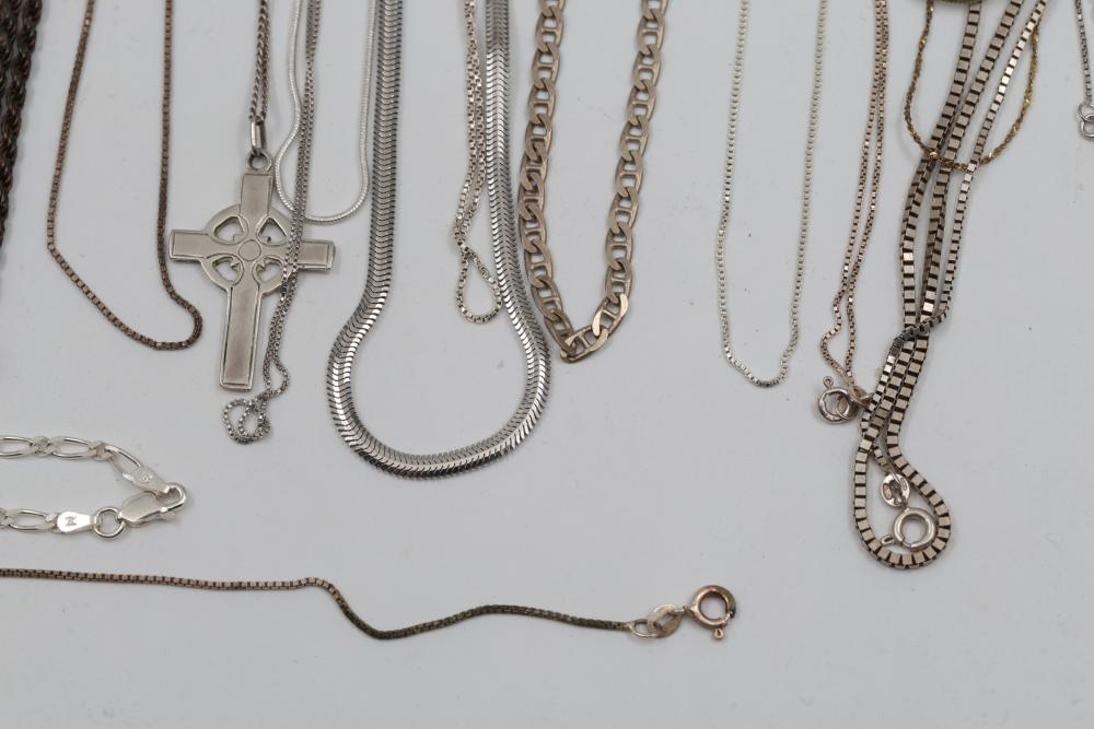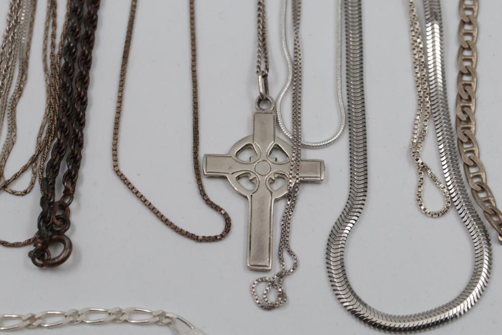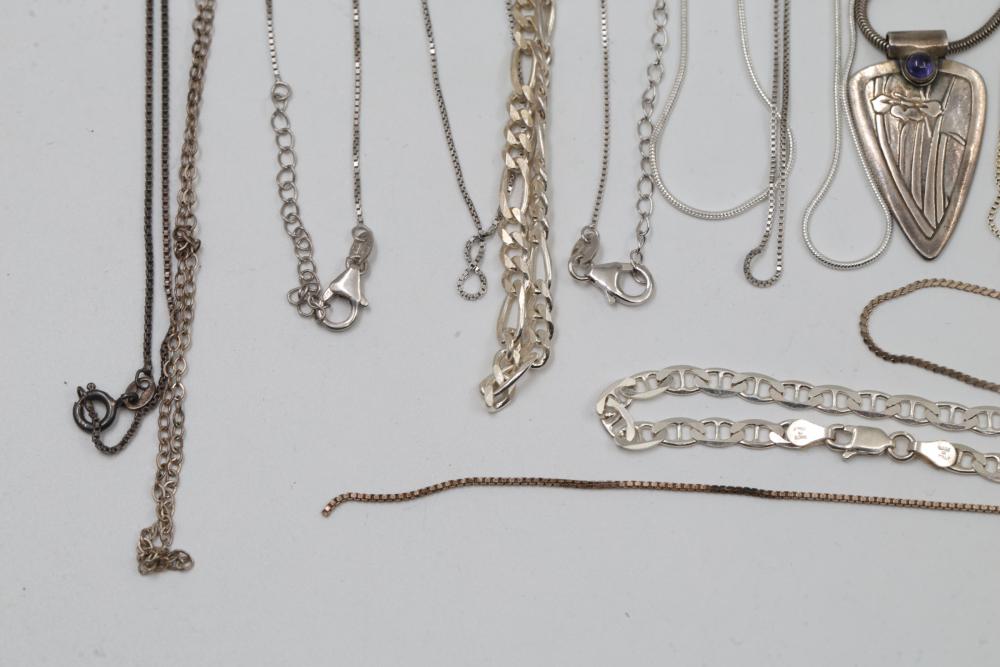 Silver and "925" marked metal necklaces and chains, including chain-link designs, pendant styles, and various clasp mechanisms. Metals include silver, gold-tone, and other finishes. Includes notable pendants such as a cross and a shield-shaped piece with a purple embellishment. Total silver weight being 220 grams.