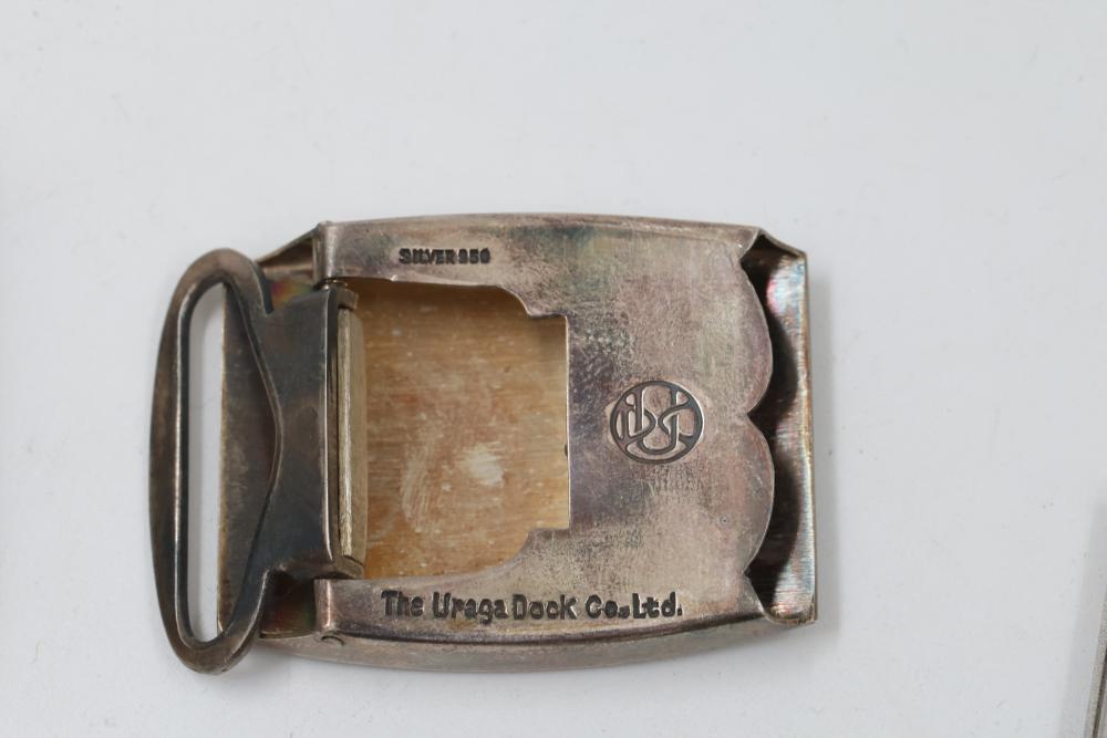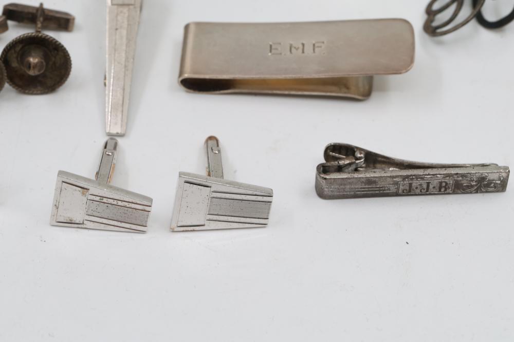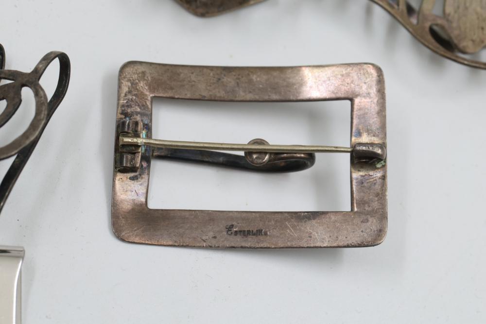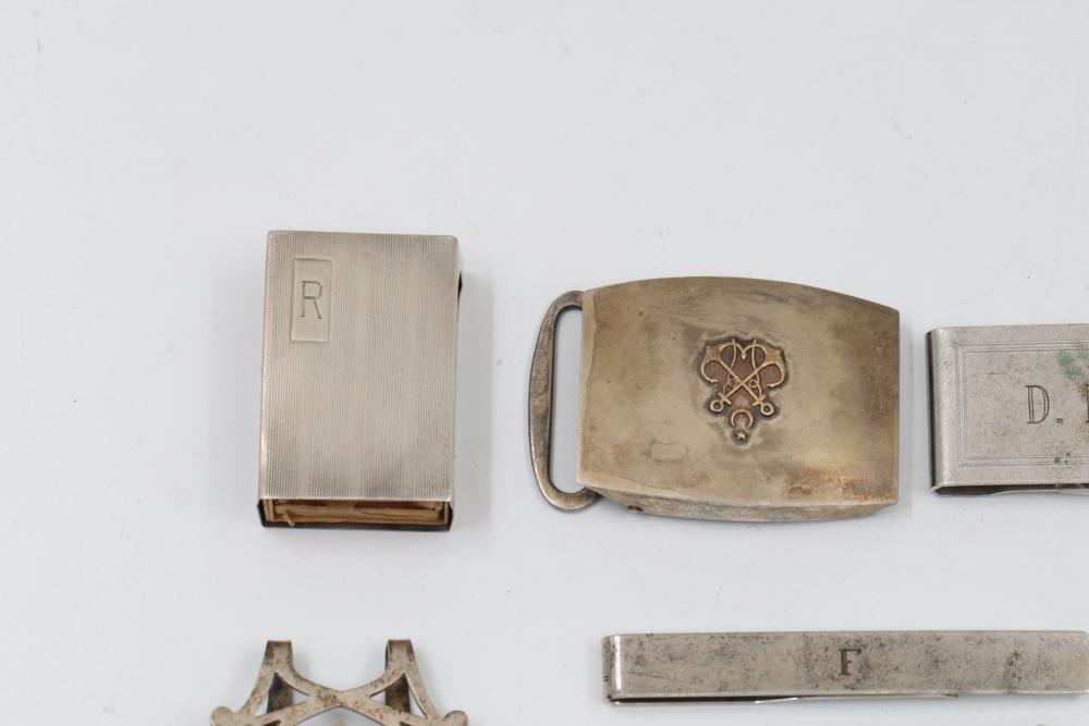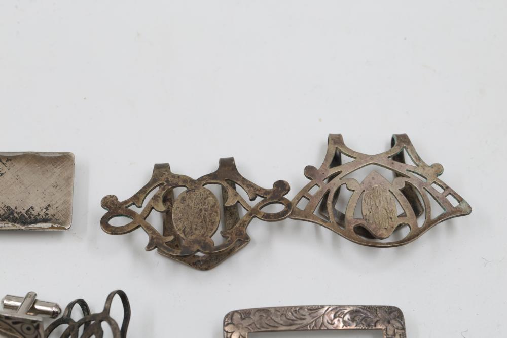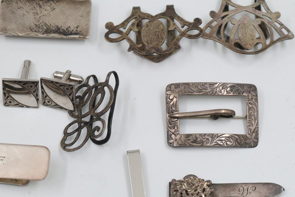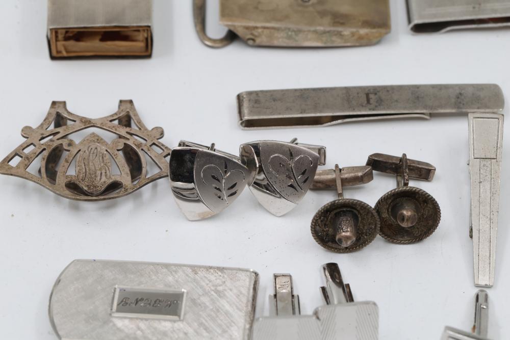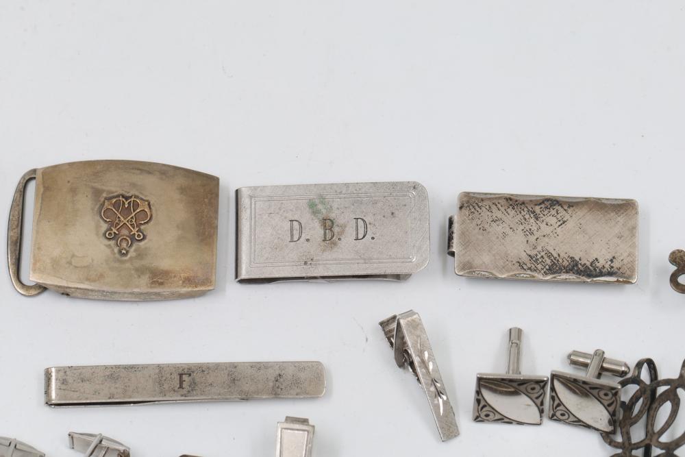 Sterling silver and metal accessories, including buckles, cufflinks, money clips, and other small items. Notable markings include "Sterling" and engraved initials or designs on several pieces. Total silver weight being 263 grams.