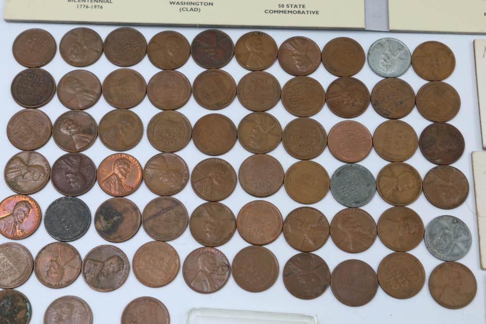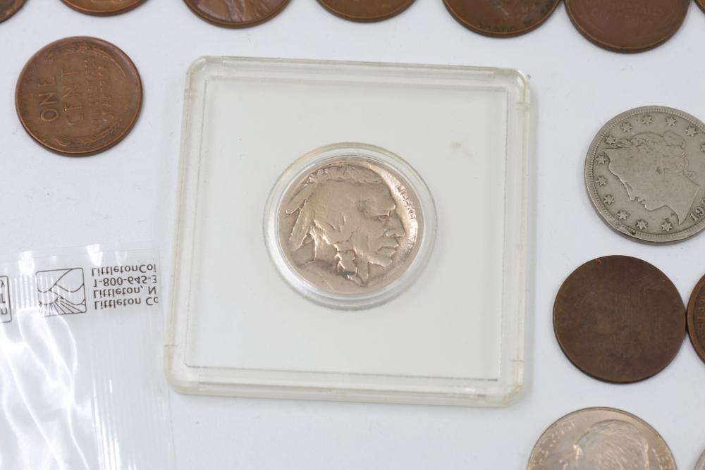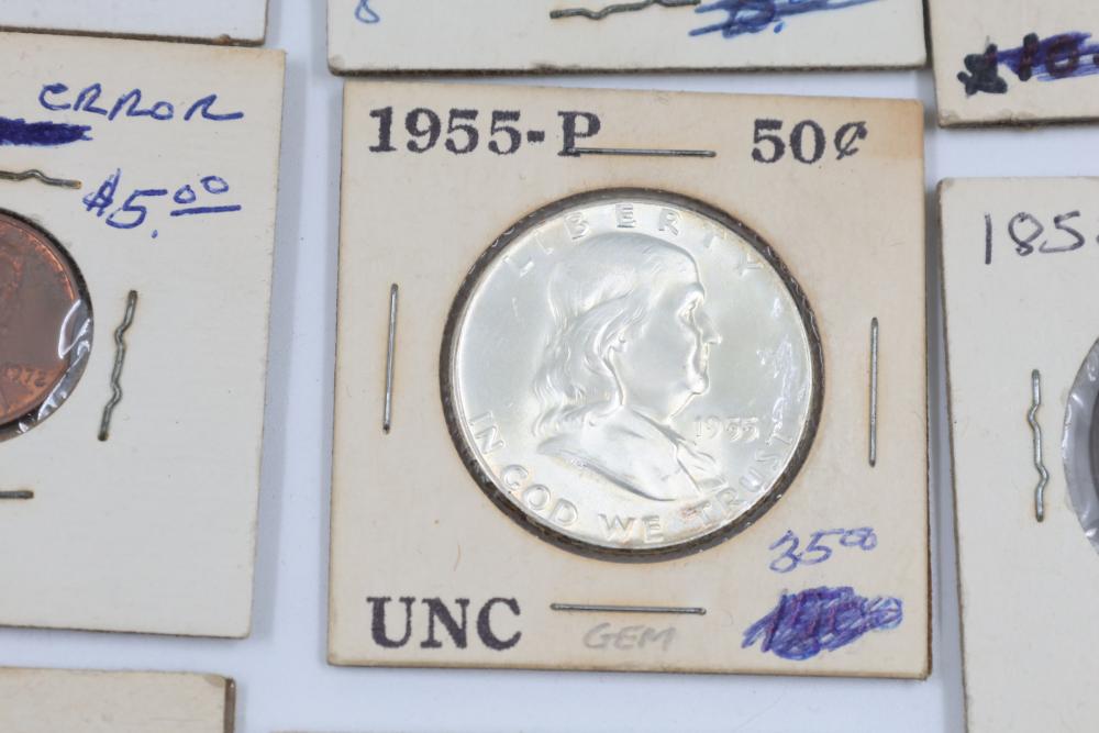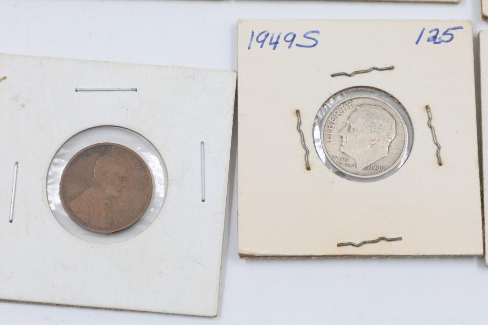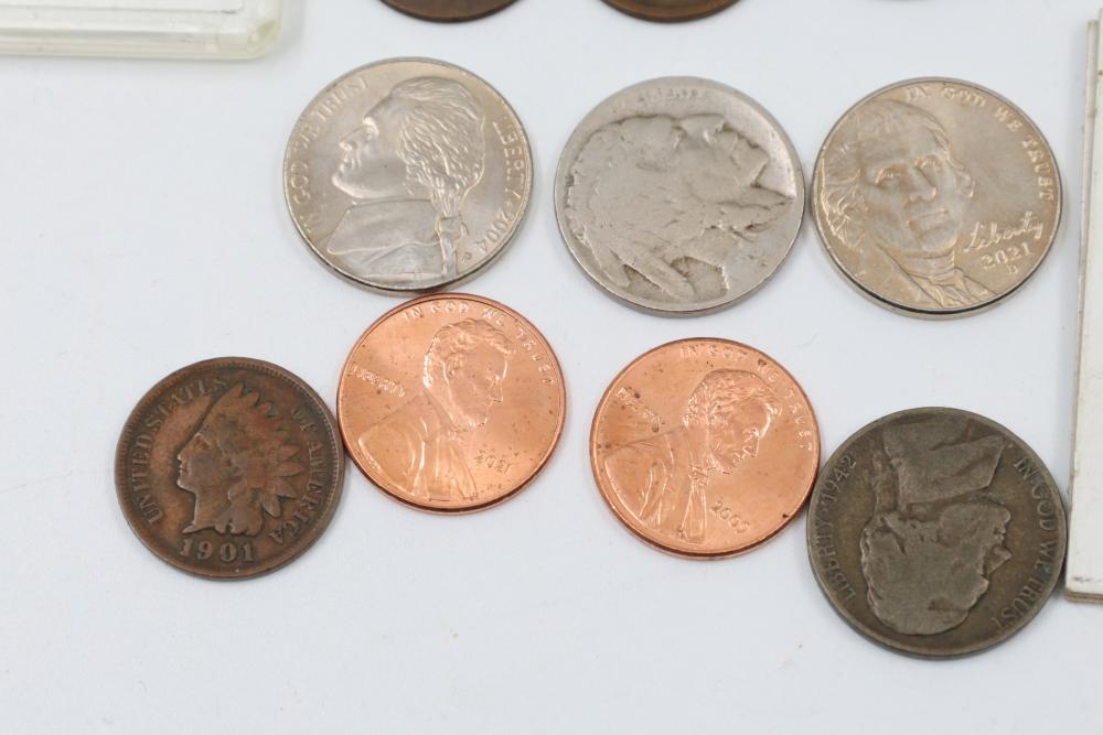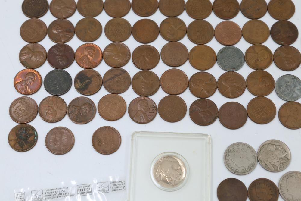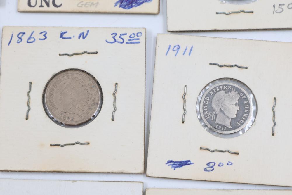 US coins featuring cents, nickels, dimes, and half dollars. Includes coins such as Indian Heads, Buffalo nickels, Mercury dimes, and Franklin half dollars, with additional pieces displayed in coin holders and albums. Some coins are marked with specific details, including dates like 1863, 1949S, and 1955-P.