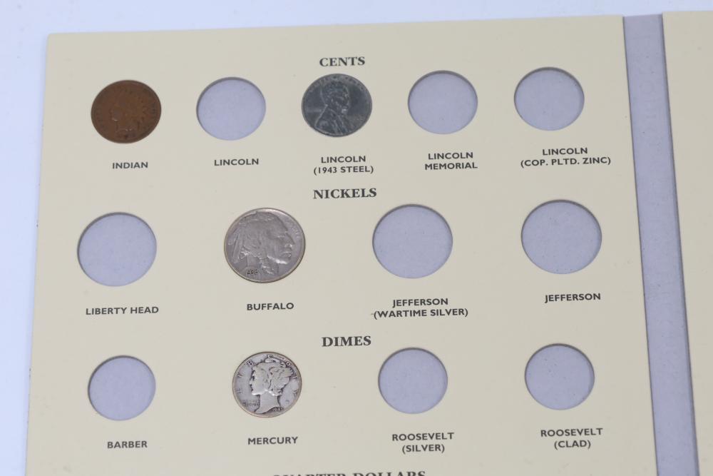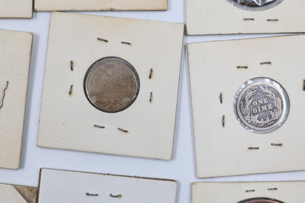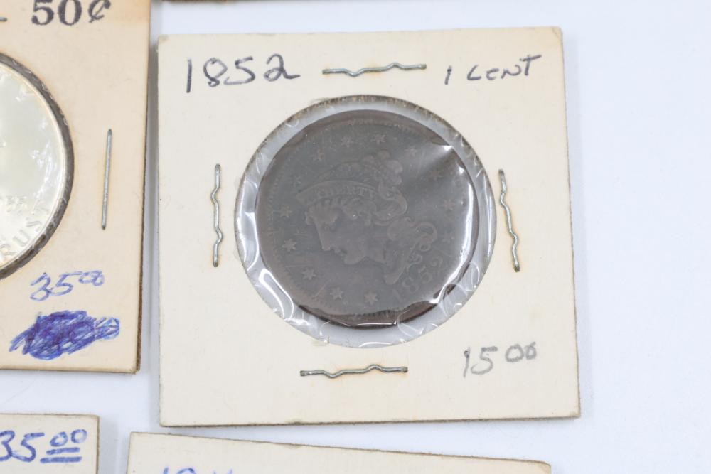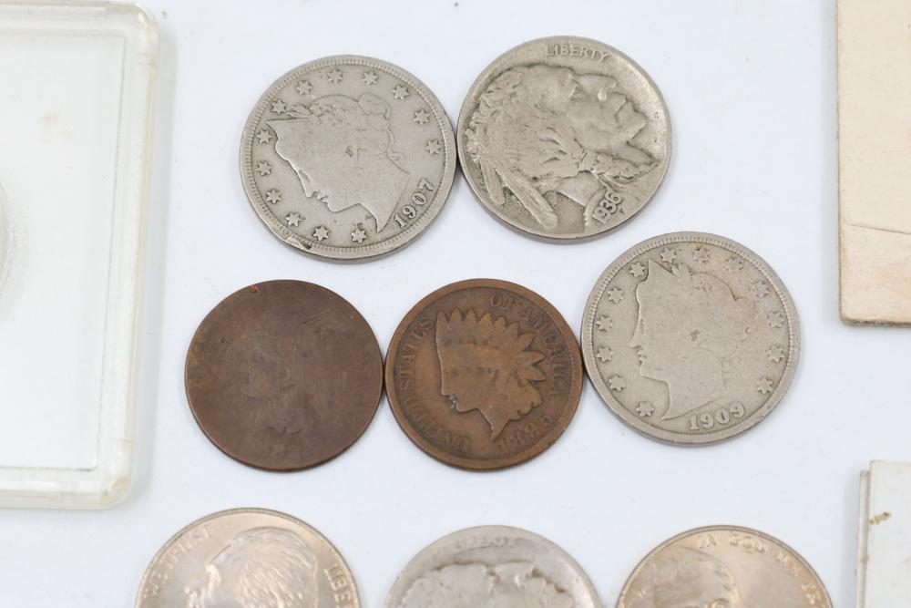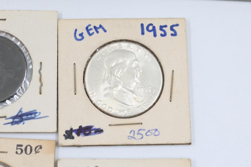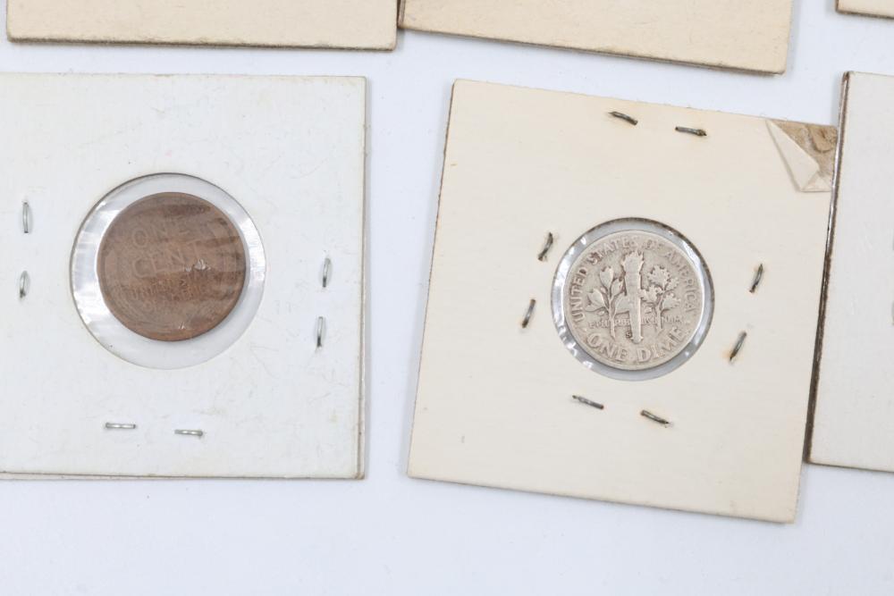 US coins featuring cents, nickels, dimes, and half dollars. Includes coins such as Indian Heads, Buffalo nickels, Mercury dimes, and Franklin half dollars, with additional pieces displayed in coin holders and albums. Some coins are marked with specific details, including dates like 1863, 1949S, and 1955-P.
