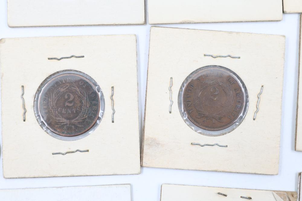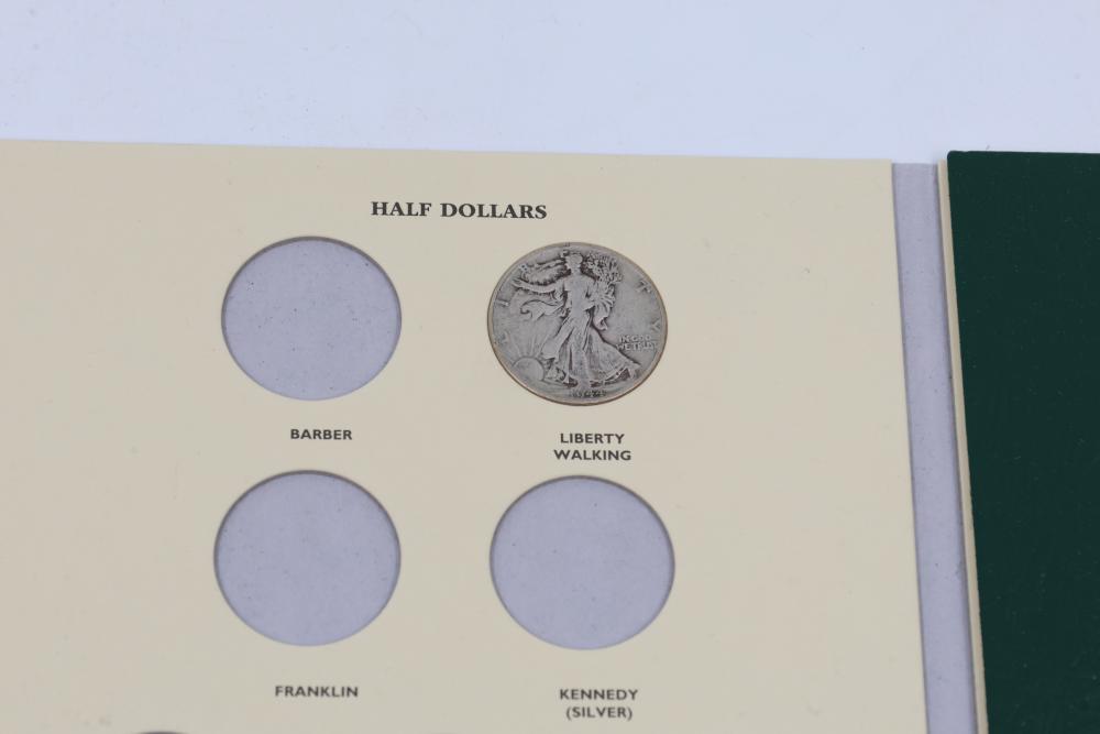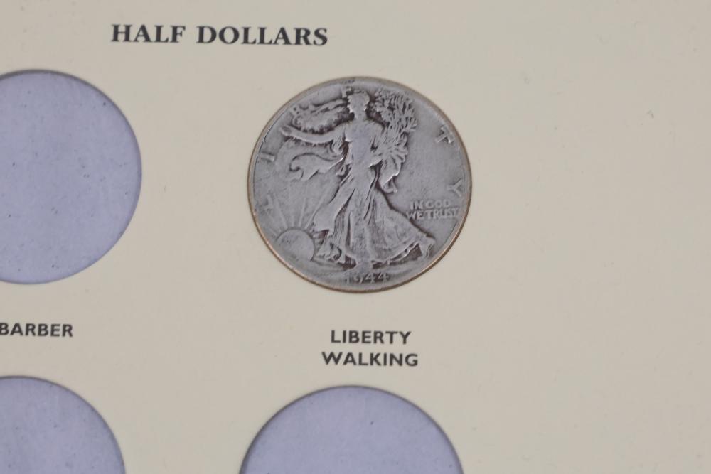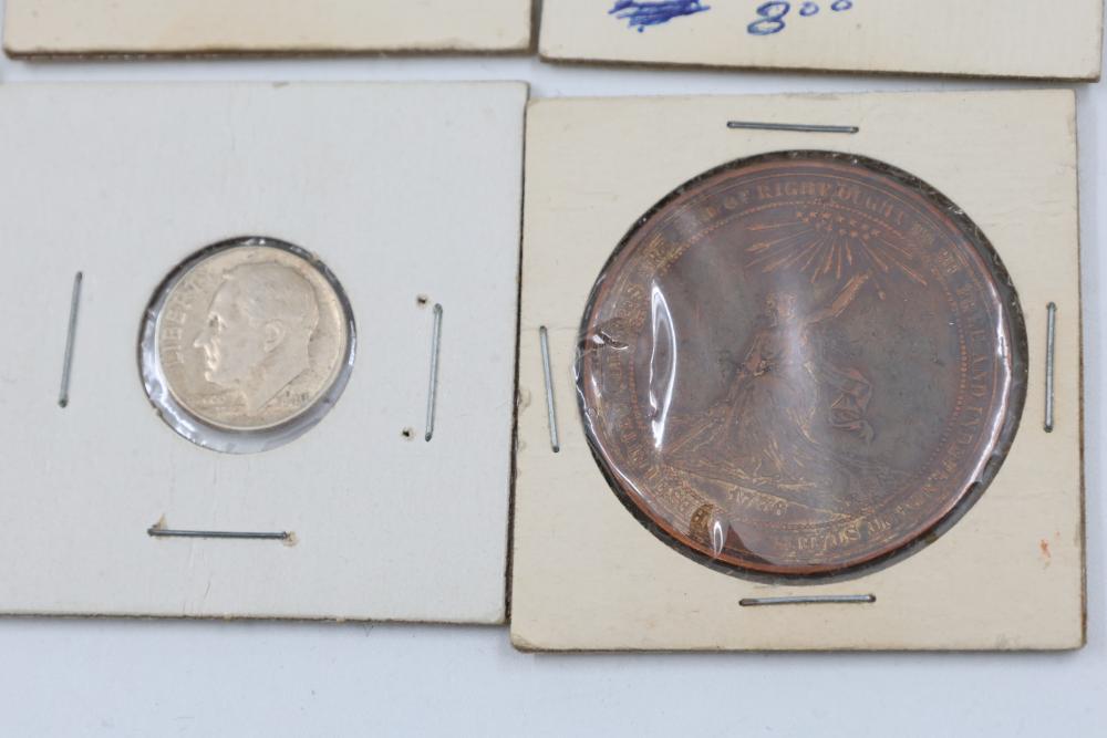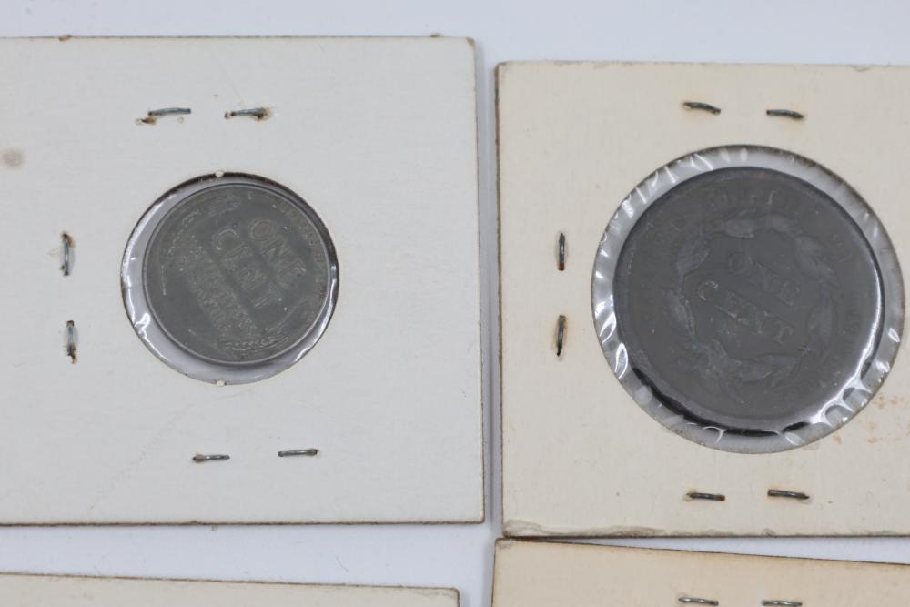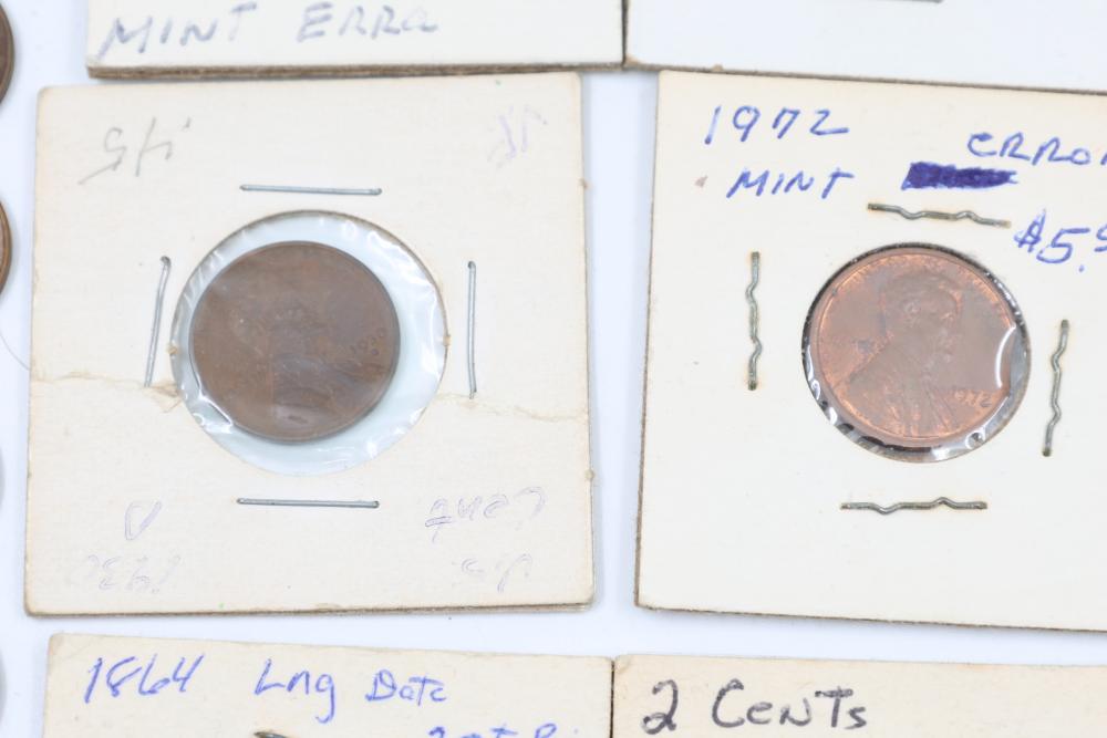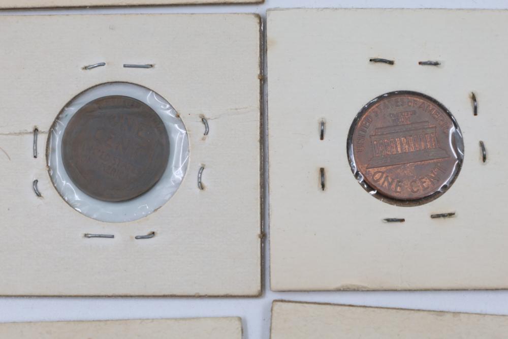 US coins featuring cents, nickels, dimes, and half dollars. Includes coins such as Indian Heads, Buffalo nickels, Mercury dimes, and Franklin half dollars, with additional pieces displayed in coin holders and albums. Some coins are marked with specific details, including dates like 1863, 1949S, and 1955-P.