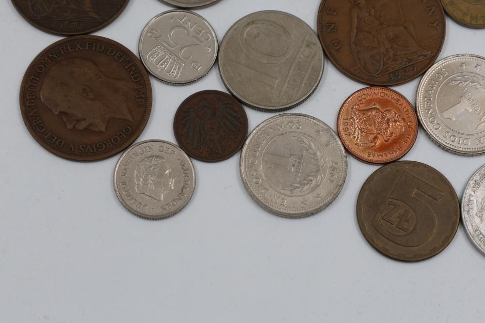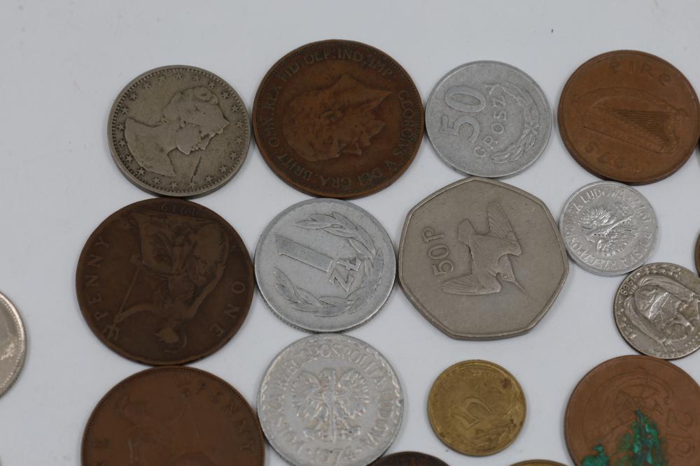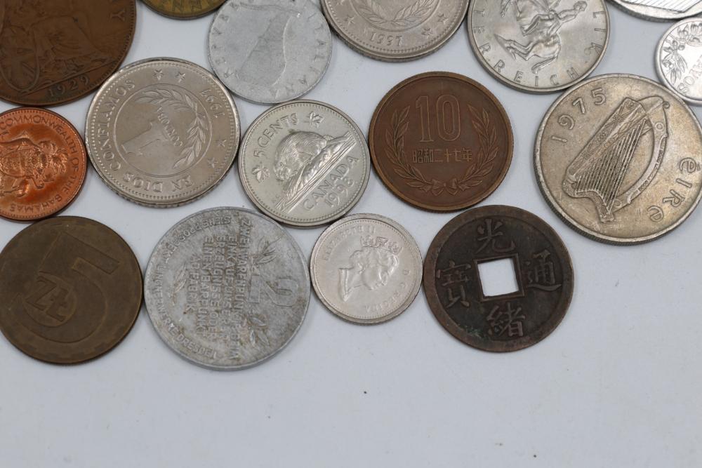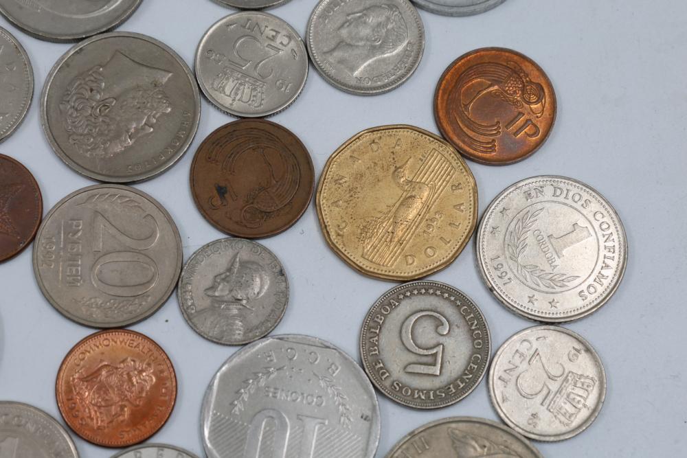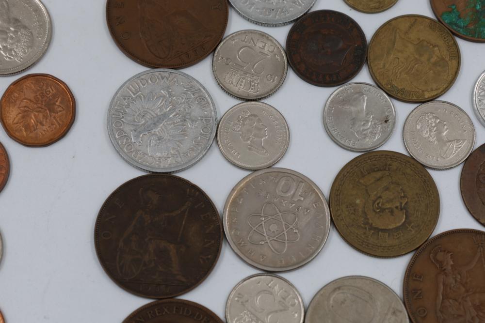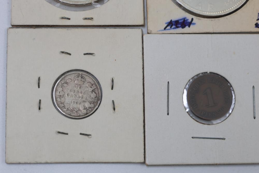 Worldwide coins and currency from various eras, including a mix of denominations, shapes, and sizes. Includes some coins in protective holders marked with dates and details, such as a 1905 Edward VII coin.