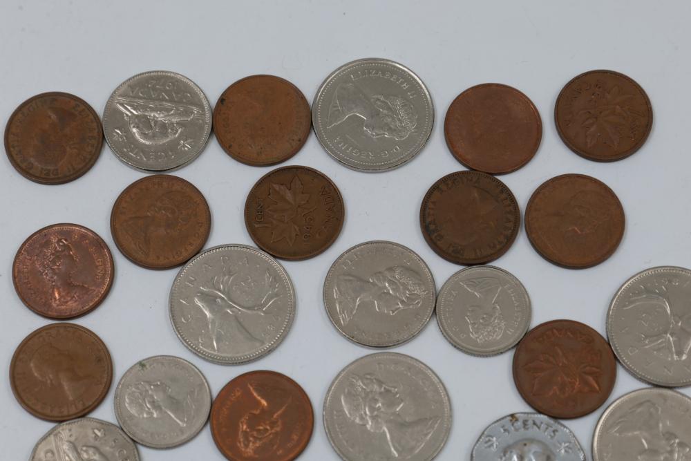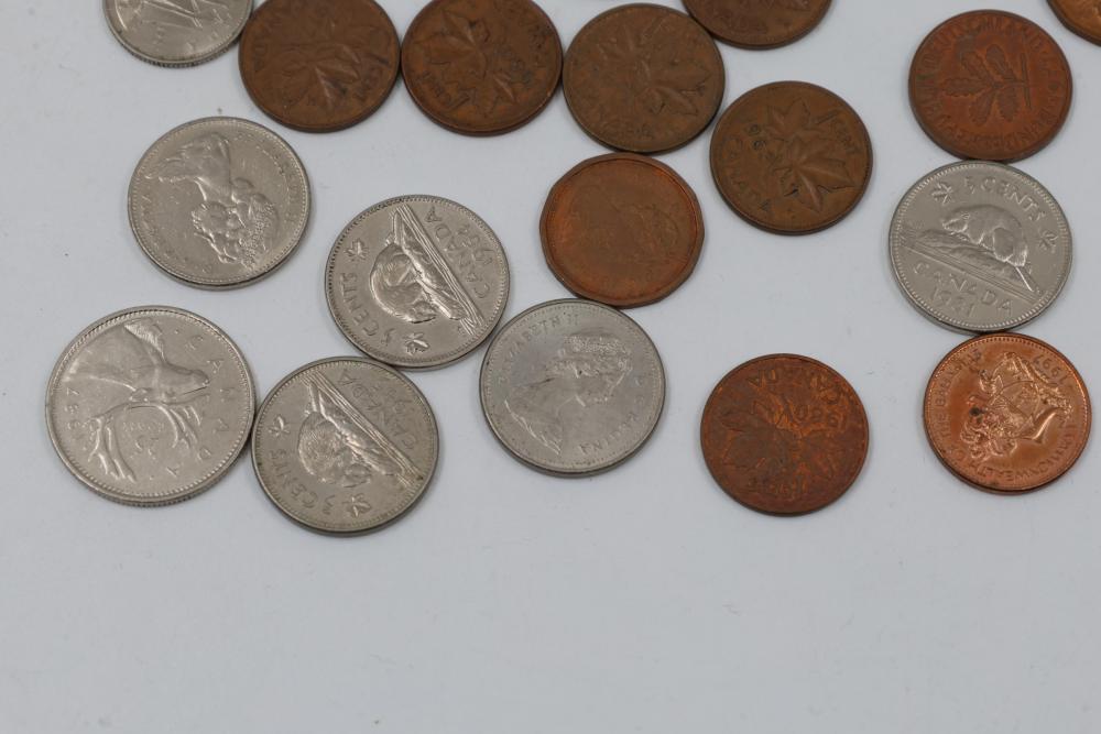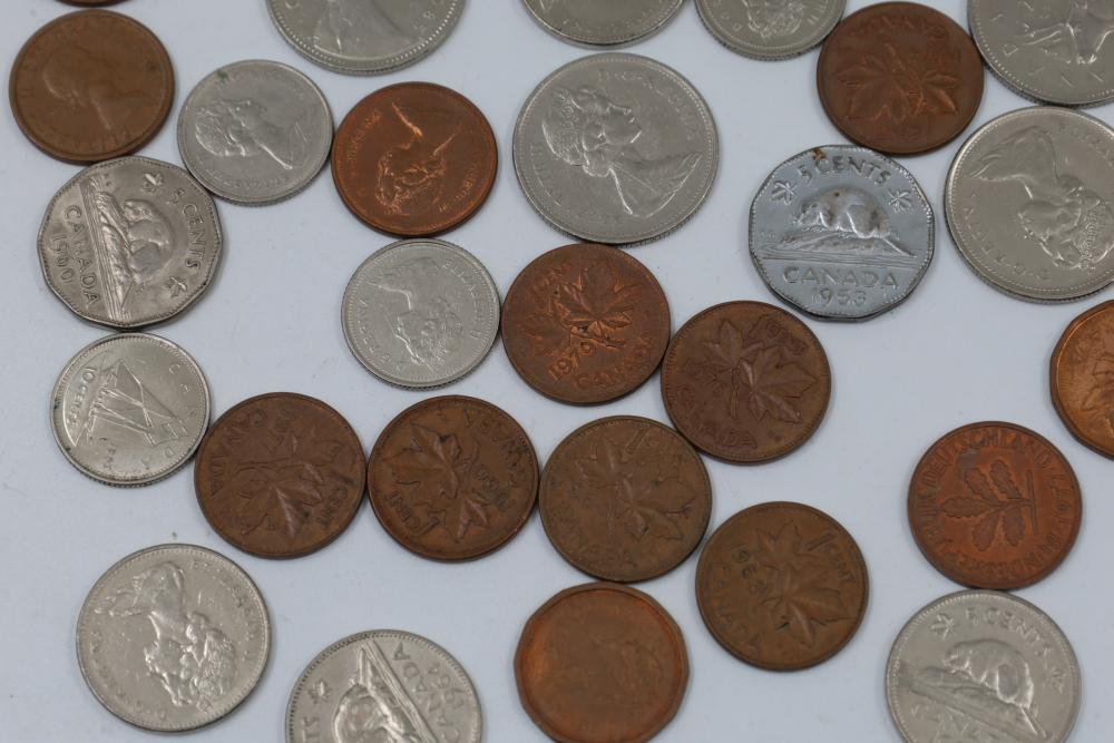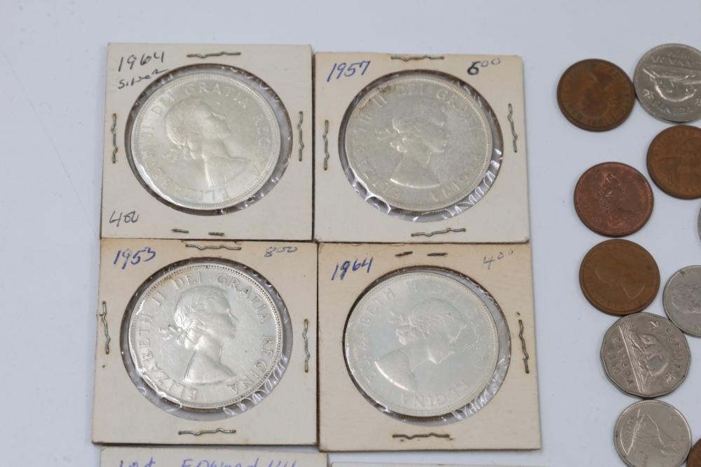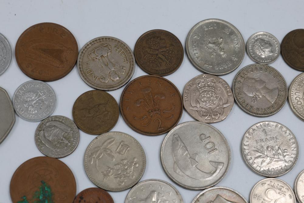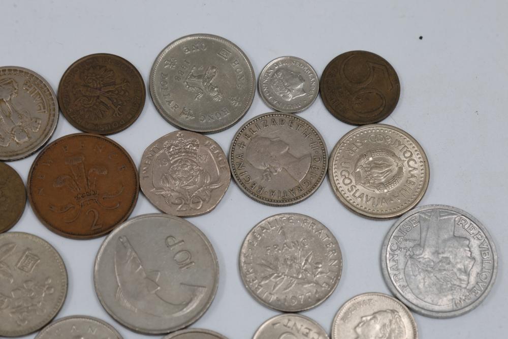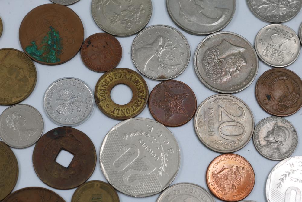 Worldwide coins and currency from various eras, including a mix of denominations, shapes, and sizes. Includes some coins in protective holders marked with dates and details, such as a 1905 Edward VII coin.