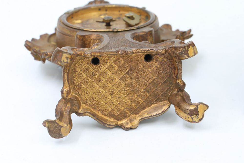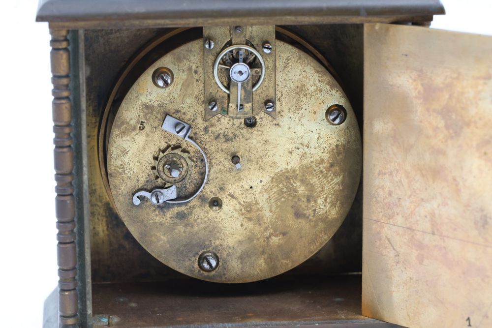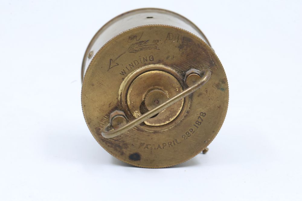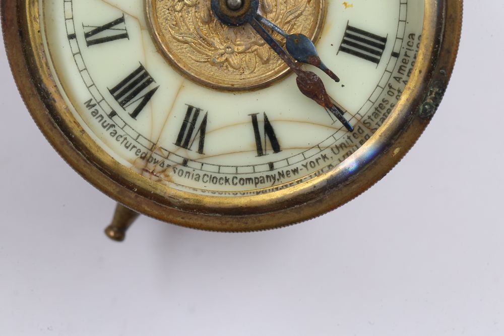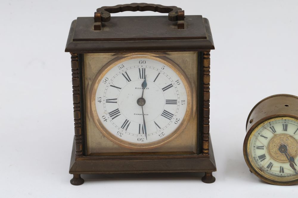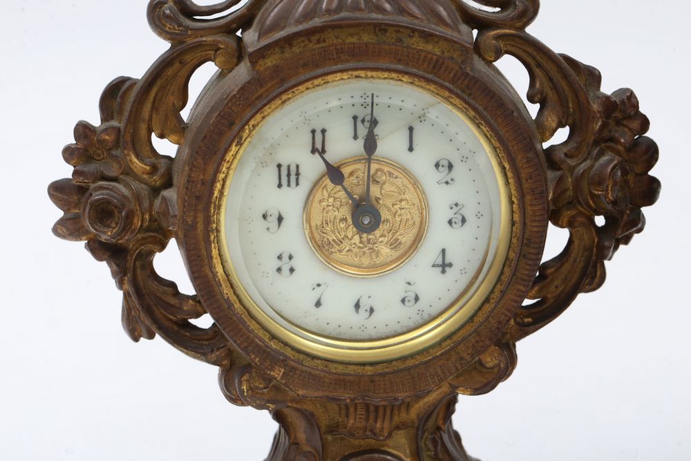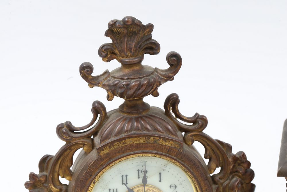 Three Decorative Clocks featuring Brass and Ornate Designs. Includes a brass cylindrical clock, an elaborately designed cast metal clock with scrollwork and floral details, and a rectangular brass and glass clock with columnar accents. Produced by notable makers including the New Haven Clock Company, as indicated on one clock. Origin and design styles reflect late-19th-century craftsmanship.