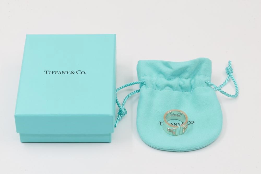 New Tiffany & Co. Sterling Silver T-Design Ring with Pouch. Crafted from .925 sterling silver, this wide band ring features an open T motif. Includes the original Tiffany & Co. drawstring pouch for safekeeping. Size 5. Total weight being 11.1 grams. Retail value of $225.