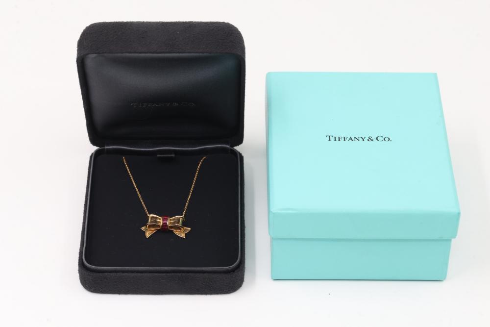 Tiffany & Co. 18K Gold Bow Pendant Necklace with Rubies. Features an 18K gold bow-shaped design adorned with baguette-cut rubies at the center and attached to a delicate chain. Marked Tiffany & Co. on the reverse. Total weight being 7 grams total. Retail value of $2,500.