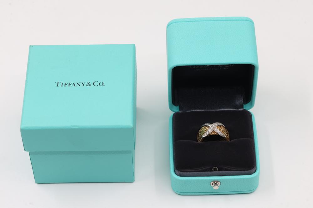 Tiffany & Co. 18K Gold Diamond Schlumberger Six 6 Row X Rope Ring. Features a woven gold band with an "X" motif set with diamonds. Includes the original Tiffany & Co. presentation box. Size 5. Total weight being 11.4 grams. Retail value of $5,000.
