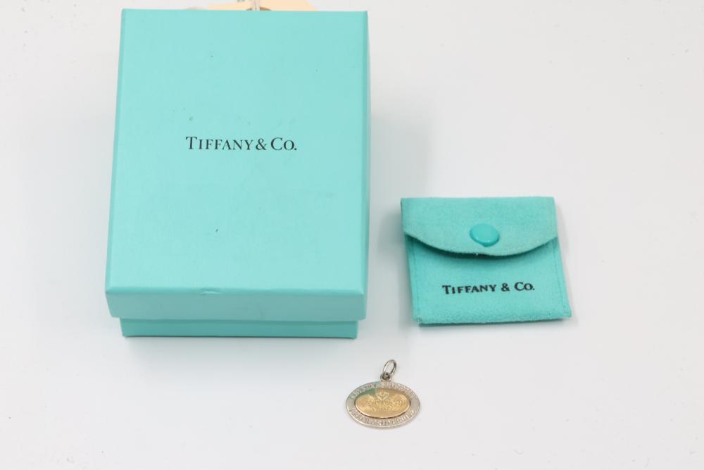 Tiffany & Co. 18K on Sterling Crystal Symphony 1999 World Cruise Sterling Pendant. This item features a sterling silver and gilt pendant inscribed with 'Crystal Symphony 1999 World Cruise.' It includes the original Tiffany & Co. pouch. Total weight being 4.9 grams.