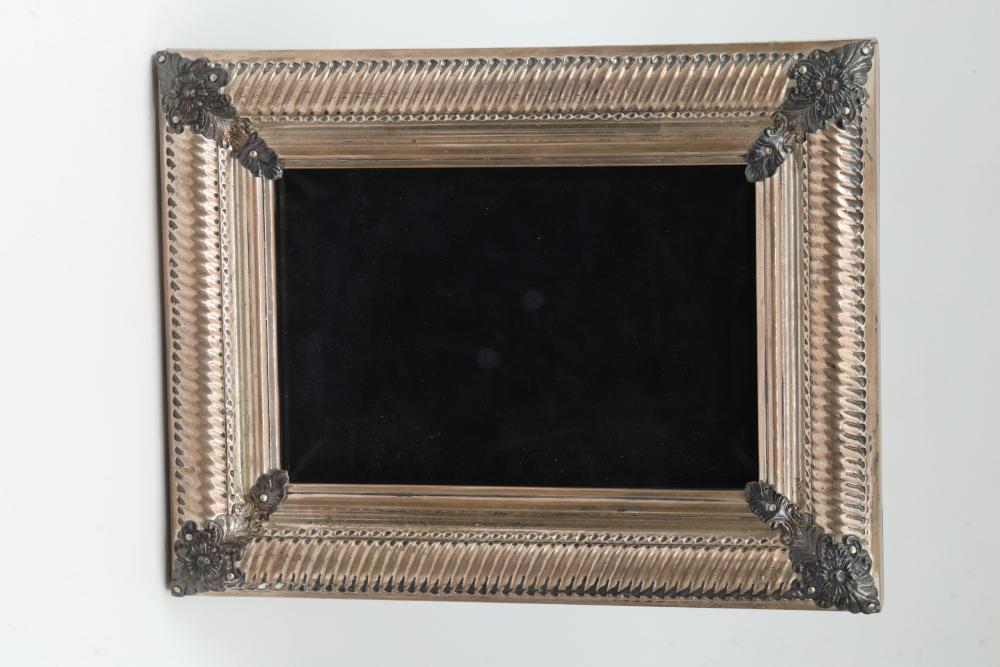 Silver hallmarked picture frame believed to be by "Juan C. Pallarolls"� with floral corner details and a textured border design. The hallmarks are present and visible along the edge of the frame. Features a rectangular display area with a back support for upright positioning. Ideal for holding a photo or artwork. Total weight being 701 grams.