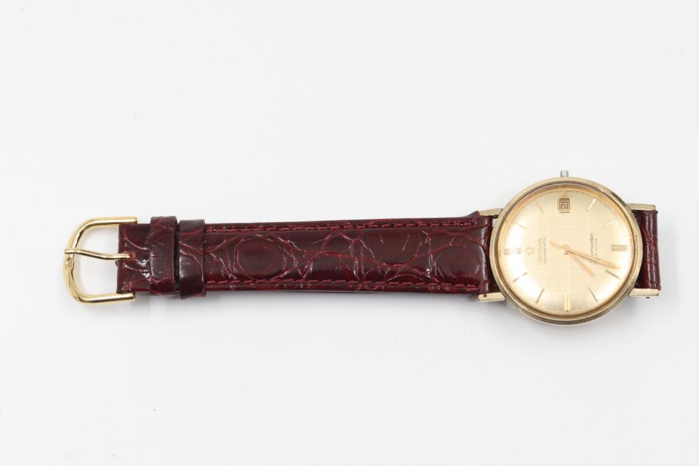 Omega Seamaster De Ville Automatic Wristwatch With Alligator Leather Strap. Features a round gold-tone case, date window at 3 o'clock, and an aftermarket red alligator leather strap marked 'XL Alligator Calf.' The back case displays the Seamaster logo.