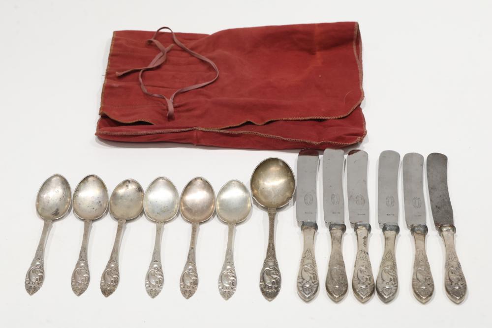 Sterling Silver Flatware including six spoons and six knives with ornate designs, and one serving spoon. Items feature intricate patterns and are marked with details, including '830S BR. Lohne' and 'Mastro A.G. Ohligs-Solingen Rustfrei.' The set includes a rolled storage case. Total weight of spoons being 241 grams, total weight of sterling handle knives being 491 grams.
