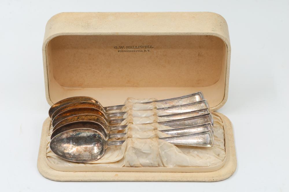 Six Sterling Silver Teaspoons with Monogram. These spoons are crafted from sterling silver and feature a monogram engraved on each handle. The set comes in a protective vintage case lined with fabric. Total weight being 245 grams.