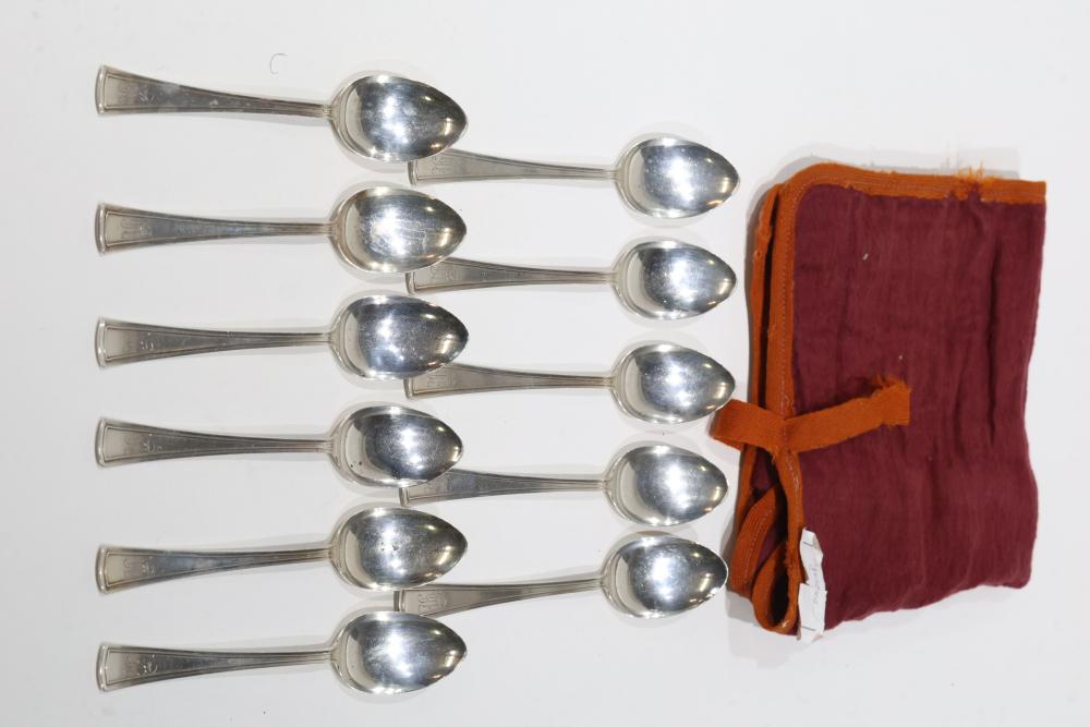 12 G.E. Butler coin silver spoons featuring engraved details and hallmarks on the handle. Each spoon has a monogram and is stamped with the maker's mark and other identifying hallmarks. Total weight being 256 grams.