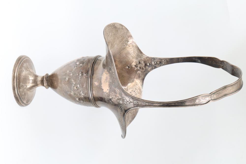 Sterling Silver ASCO Footed Ewer with Engraved Details. Features an ornate handle and engraved floral and scrollwork details. Marked "ASCO Sterling" beneath the base, along with additional embossed design elements. Total weight being 1,032 grams.