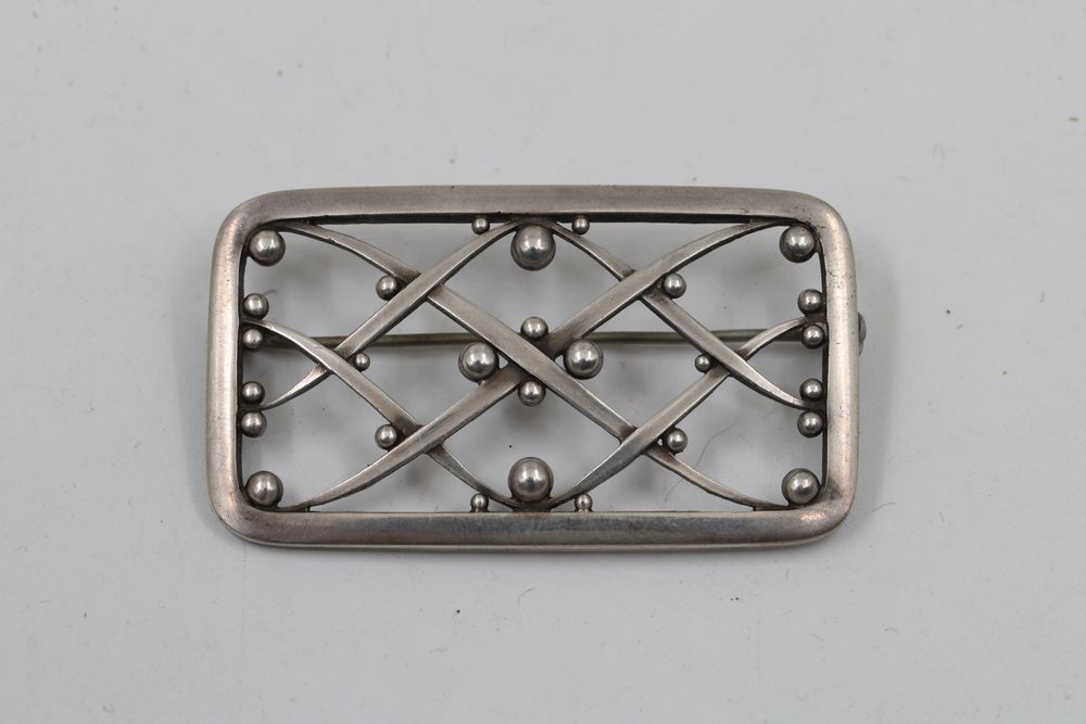 Georg Jensen Sterling Silver 266 Rectangular Brooch with Openwork Design. Features a rectangular form with intricate crisscross and bead details. Marked 'Georg Jensen,' 'Sterling,' 'Denmark,' and '266' on the reverse. Includes a secure pin clasp. Sterling weight being 14 grams.