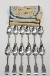 11 Sterling Silver Spoons with Monogram. Marked "Sterling" on the back of each handle. Features an engraved monogram on each spoon and comes in fabric storage wrap. Total weight being 221 grams.