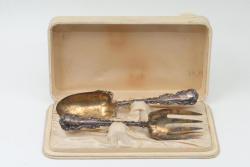Sterling Silver Serving Fork and Spoon in Original Case. The items feature ornate detailing on the handles and are marked as sterling. Includes the original fitted case. Total weight being 145 grams.