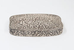 Howard & Co Sterling Silver Hinged Box with Floral Design. This rectangular box is adorned with intricate floral and leaf patterns on all sides and features a hinged lid. The interior of the box has a smooth silver finish, and the underside is marked with 'Howard & Co' and 'Sterling.' Total weight being 312 grams.