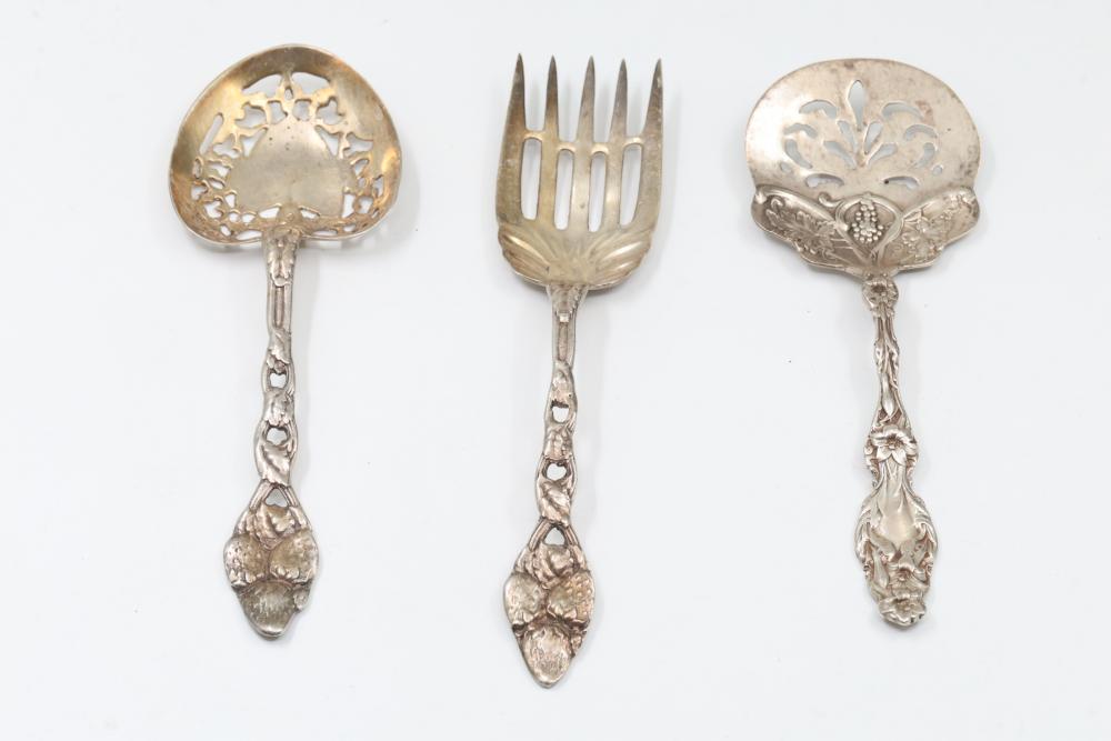 Three Sterling Silver Utensils with Ornate Designs. Includes a serving fork and two serving spoons, each showcasing intricate openwork patterns and detailed handles. Marked 'Sterling' on each piece. Total weight being 316 grams.