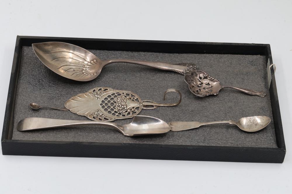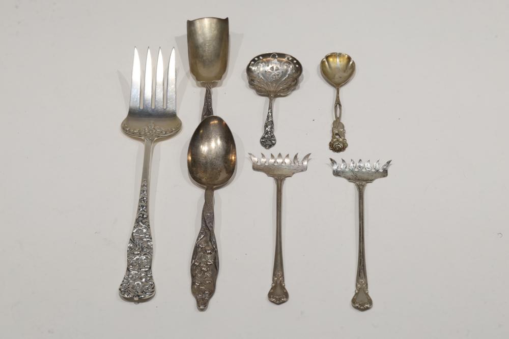 Silver, Metalware, and Utensils With Decorative Elements. Includes a variety of items such as an ornate cruet set, various utensils with decorative handles, a pierced server, salt and pepper shakers, a silver thimble, a bell with engraved handle, and other similar small decorative items. Some items with sterling caps and handles. Pickup only.