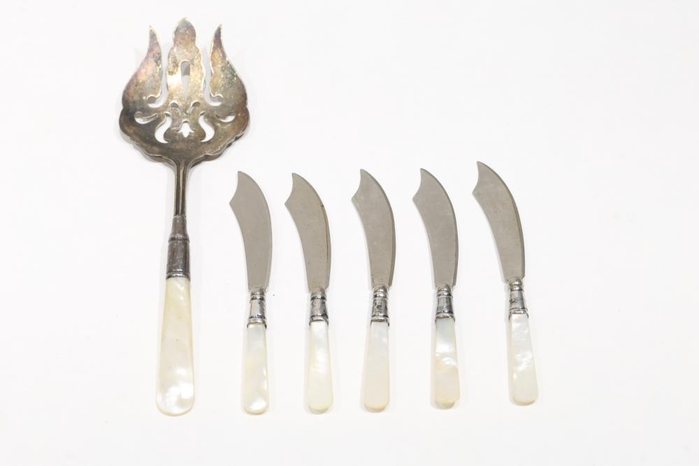 Mother of Pearl Handle Sterling flatware set featuring a serving utensil and five knives. Each piece is marked sterling, with handles made of mother of pearl. Total weight being 167 grams.