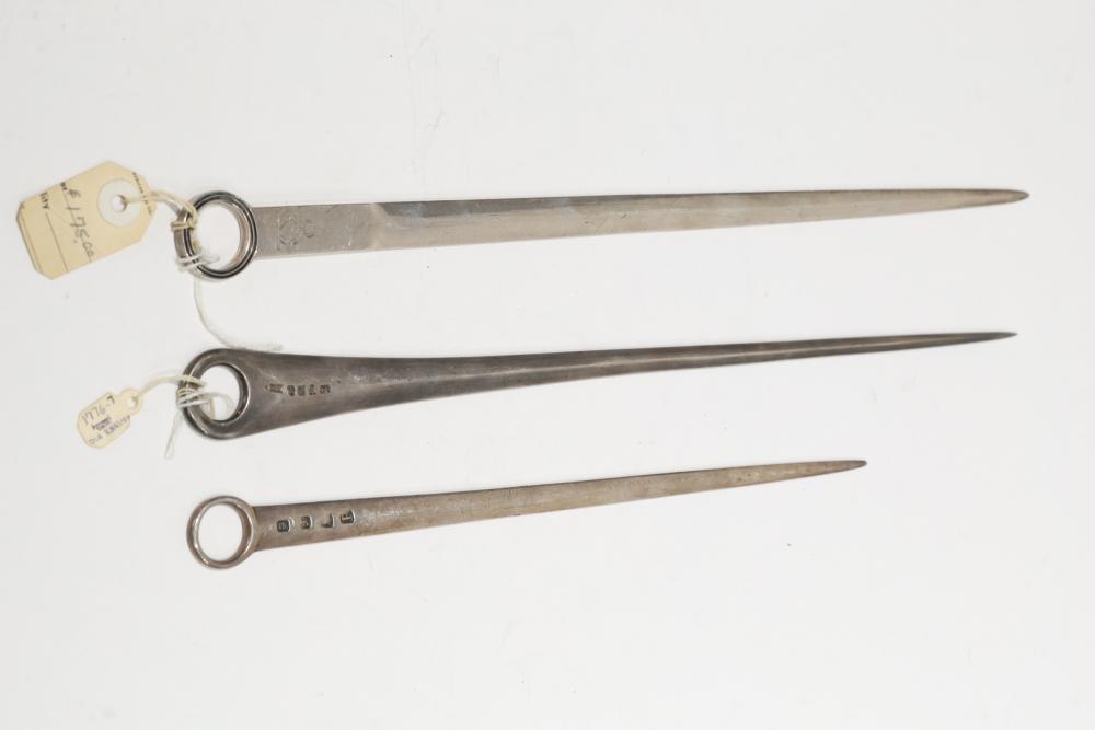 Three Hallmarked Silver Tapered Meat Skewers with Decorative Engravings. Includes three elongated skewers of different lengths, all featuring hallmarks and decorative engravings. Each skewer has a circular handle end and a tapered point. Total weight being 321 grams.