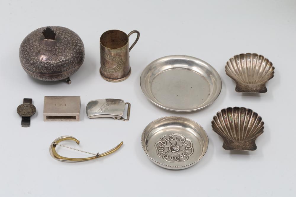 Sterling Silver Assortment with Decorative and Functional Items. Includes a variety of sterling silver pieces, such as a small mug, shell-shaped dishes, decorative circular trays, a brooch, a lidded container, and other small items. Some items display markings, engravings, or hallmarks indicating .925 sterling silver. Total weight being 322 grams.