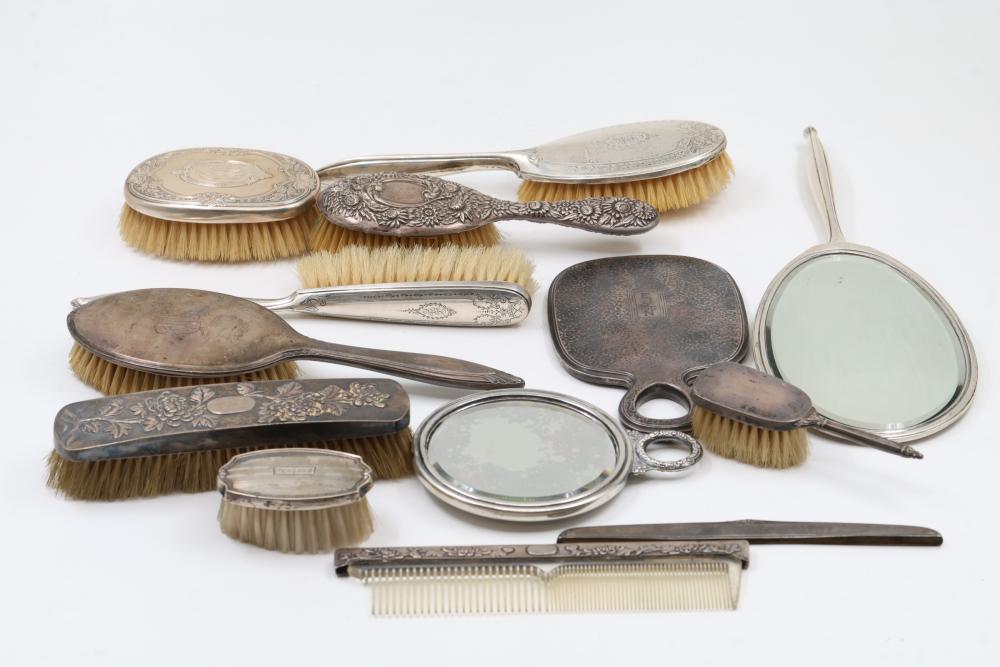 Sterling Vanity Set Brushes, Mirrors, and Comb. Includes multiple sterling silver grooming items such as mirrors, brushes, comb, and additional accessories, all with ornate designs and sterling silver handles. Total weight being 1773 grams.