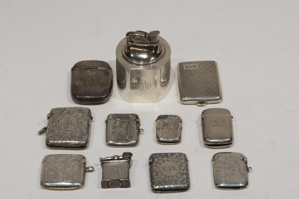 Sterling Silver Match Safes and Lighter Grouping. Includes a variety of sterling silver match safes with intricate engraved designs, monograms, and maker's hallmarks, along with two silver lighters, one of which is marked "Black, Starr & Gorham Sterling Weighted 555." Several pieces are marked with sterling or hallmark stamps. Total weight being 526 grams.