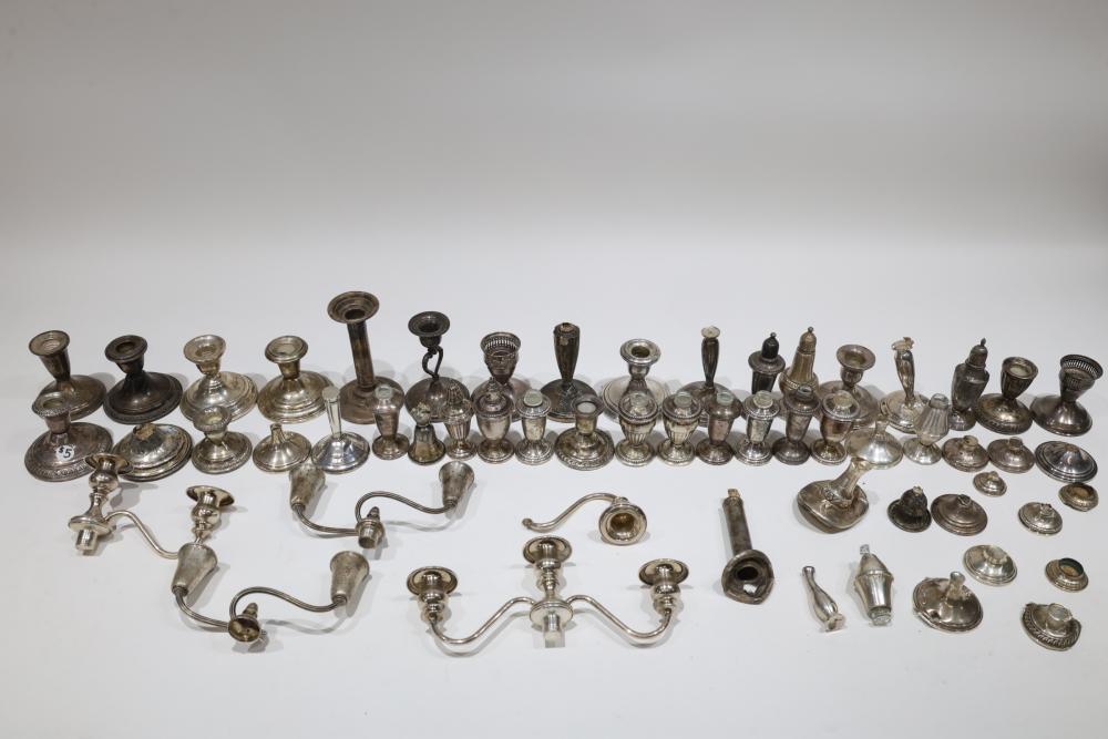Sterling Silver Weighted Candlesticks and Shakers. Includes an assortment of candlesticks, salt and pepper shakers. Many pieces are marked "Sterling,"�"Weighted,"� or include specific maker's marks such as Duchin Creation and Empire Silver Co.
