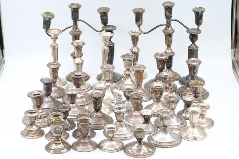 Sterling Silver Weighted Candle Holders and Candelabra. Includes a variety of sizes and designs, ranging from single candle holders to multi-arm candelabra. Materials include sterling silver with weighted bases, and some items marked as reinforced with rods or cement-filled. Makers include Alvin, Towle, Gorham, Fisher, and others, as indicated on bases.