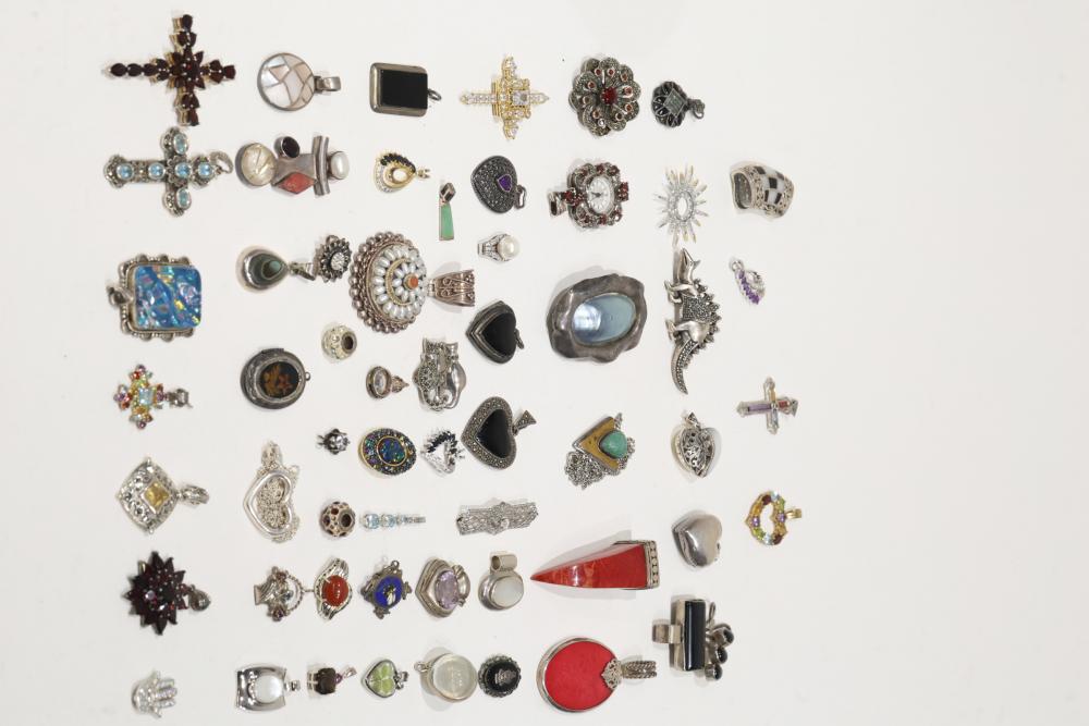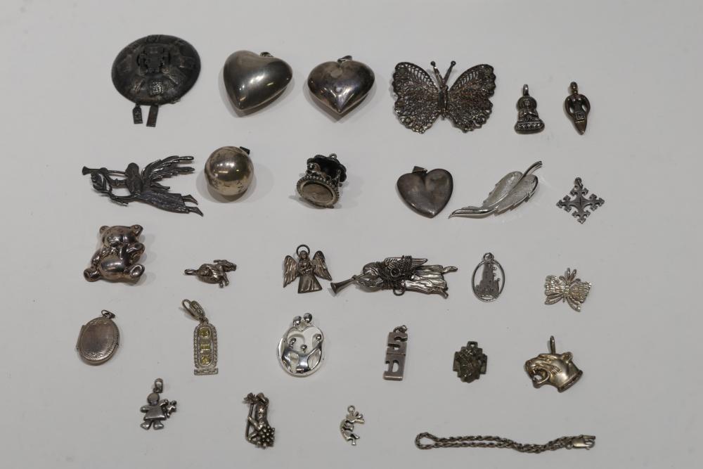 Sterling Silver Jewelry Including Pendants and Charms, with many stamped 925 or sterling. Designs range from hearts, animals, angels, and ornate patterns to abstract figures and symbols. Total weight being 208 grams.