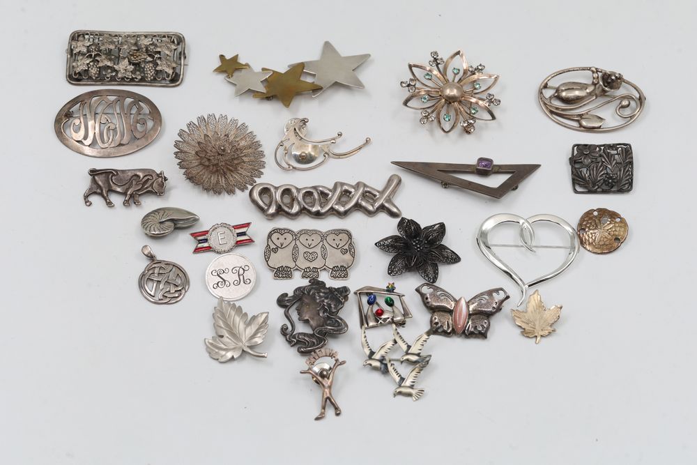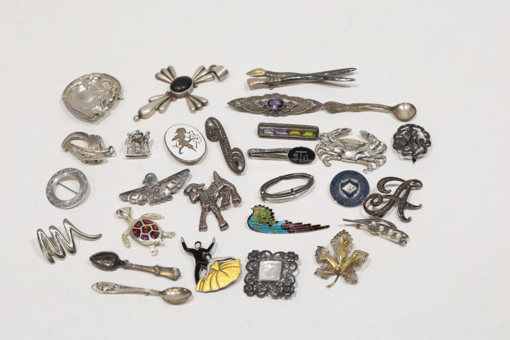 Sterling Silver Jewelry, Brooches, and Decorative Items. Includes various silver and enamel pins, brooches shaped as animals, and decorative spoons, with several stamped 925 or Sterling. Items range in styles and designs, incorporating elements like filigree and enamel. Total weight being 218 grams.