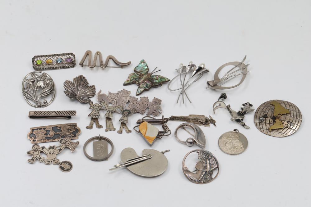 Sterling Silver Jewelry and Accessories including brooches, pendants, keychains, and pins. Pieces feature various designs, including floral, butterfly, abstract patterns, and engraved motifs. Some items are stamped with sterling or 925 marks. Total weight being 213 grams total.