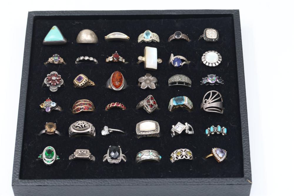 Sterling Silver Rings With Gemstone Accents. Includes a variety of styles and designs, some featuring Diamonds, other precious stones and detailed craftsmanship. Several rings are marked 925 or sterling silver. The set displays a range of shapes and decorative patterns. Total weight being 192 grams.