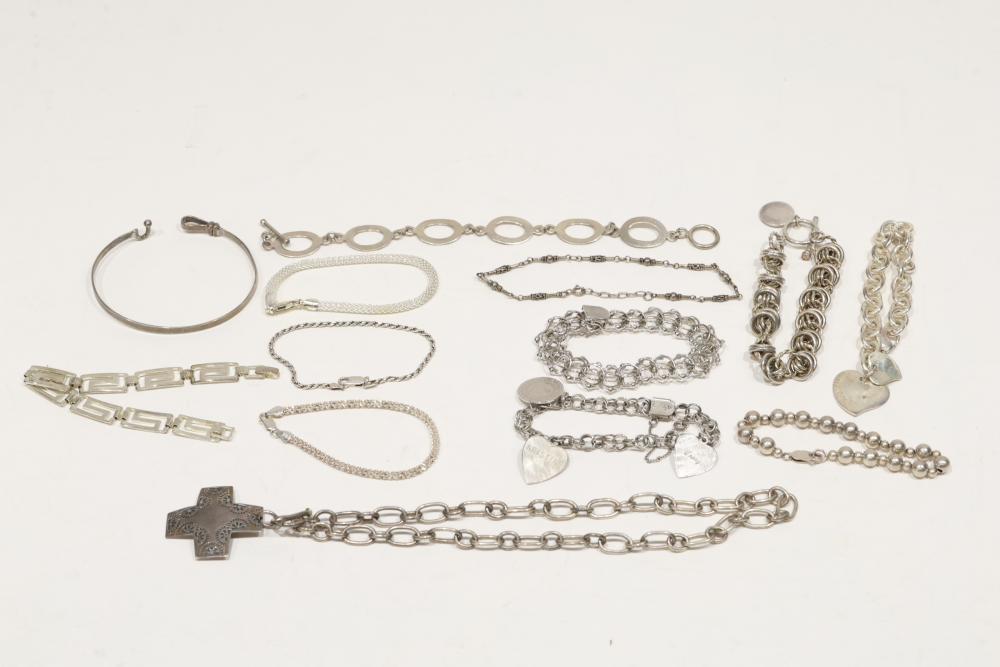 Sterling Silver Jewelry, Including Bracelets and Necklaces. Assortment of jewelry pieces featuring various styles and designs. Includes necklaces, bracelets, and decorative charms. Items are marked with sterling and other hallmarks. Total weight being 211 grams.