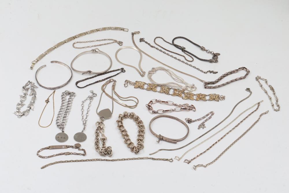Sterling Silver Jewelry Includes bracelets, necklaces, and bangles, stamped 925. Features a variety of designs including chain links, beadwork, and engraved details. Total weight being 206 grams.