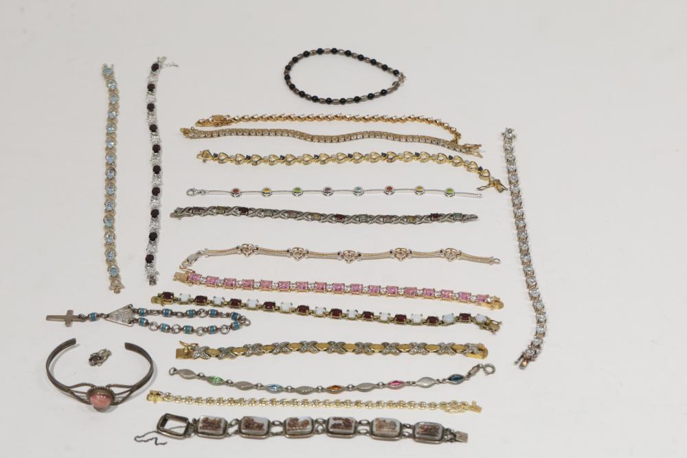 Sterling Silver and Gold-Tone Bracelets with Charms. Includes bracelets made of sterling silver marked 925 and some with gold-tone finishes. Features various designs, including chain styles, tennis bracelet styles with stones, and charm bracelets with decorative pendants. Total weight being 215 grams.