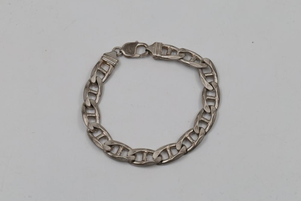 Sterling Silver 925 Figaro Chain Bracelet with Lobster Clasp. Marked 925 for sterling silver content. Features a Figaro-style chain design with a secure lobster clasp for easy wear. Total weight being 42 grams.