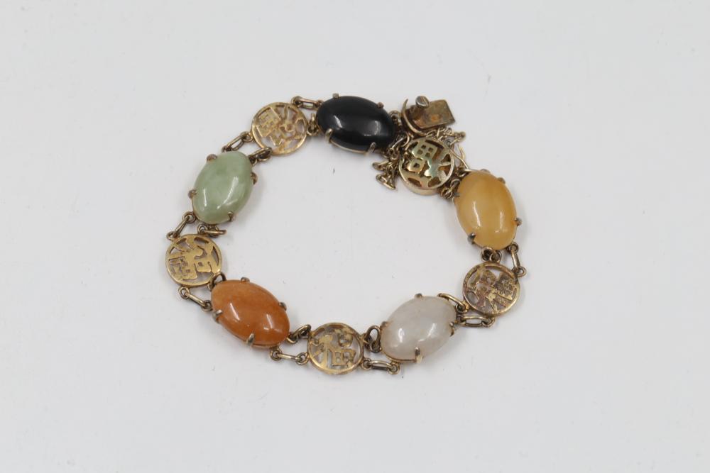 Silver Bracelet With Multicolored Jade and Symbolic Accents. Features alternating oval Jade in green, black, yellow, orange, and white hues. Accented with gold-tone symbols linked on a delicate chain. Marked 'Silver' on the clasp. Total weight being 12 grams.