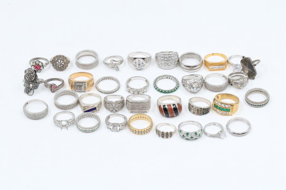 Rings with Gemstone and Metal Designs. Includes a variety of designs ranging from filigree settings, colored stones, and intricate metalwork. Notable features include heart motifs, bow shapes, inset gemstones, and textured bands. Mixed materials may be present, including metal and imitation or natural stones. Sterling weight being 39 grams. Total weight being 213 grams.