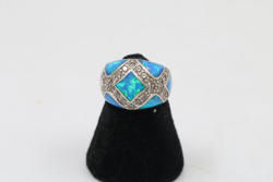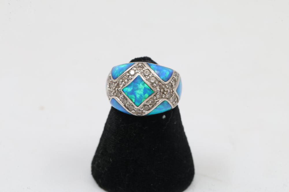 Sterling silver ring featuring blue opal inlays in a geometric motif, complemented by clear stone accents arranged in a cross-shaped design. The interior band is marked "925." Total weight being 7 grams.