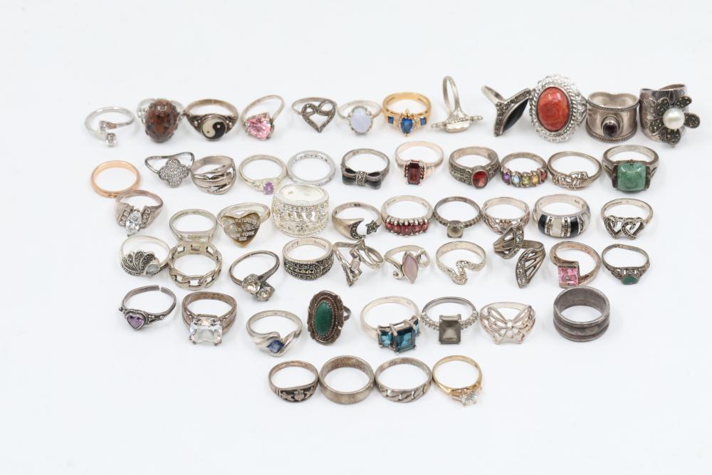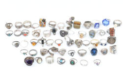 50+ rings featuring sterling silver settings, varied designs, and embellishments including gemstones, enamel, and cabochon stones. Styles include ornate and geometric, with materials such as turquoise, amber, and lapis referenced. Sterling weight 98 grams. Total weight being 277 grams.