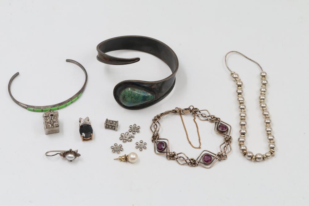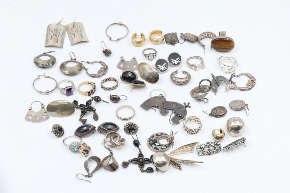 Silver and costume jewelry, featuring rings, earrings, pendants, and pins. Includes pieces with various designs, stones, and engraved elements. Sterling weight being 146 grams. Total weight being 239 grams.