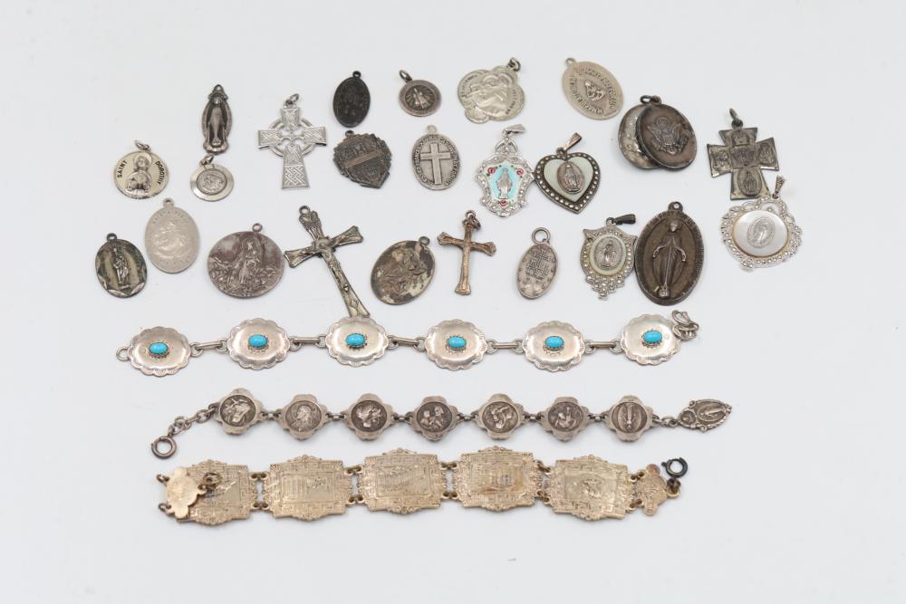 Religious medals, charms, crosses, and bracelets. Includes a variety of designs featuring Saints, the Virgin Mary, and turquoise-accented elements. Two bracelets showcase engraved panels, one with religious imagery. Silver weight being 156 grams. Total weight being 193 grams.