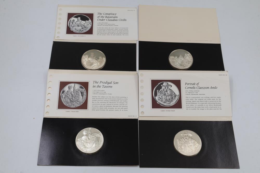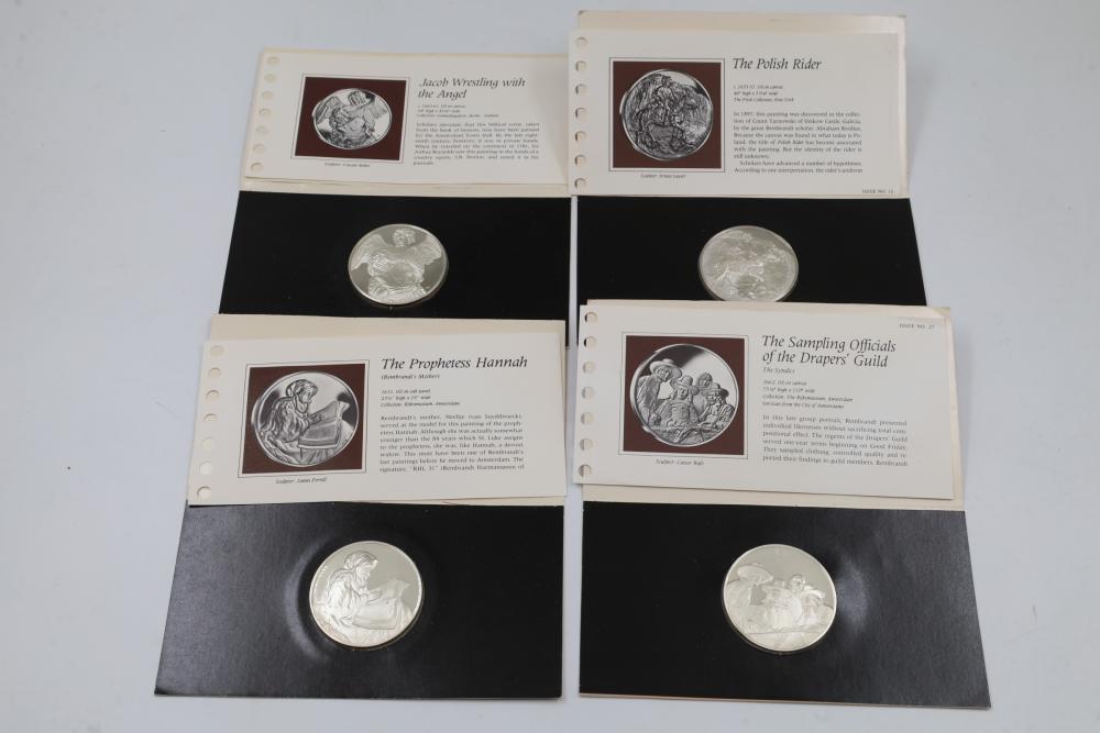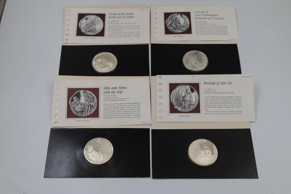 (4) Franklin Mint silver medals featuring artworks related to Rembrandt, including "Sophonisba Receiving the Poisoned Cup", "The Apostle Peter Denying Christ", "The Raising of the Cross" and "Self-portrait". Each medal includes an informational card with details about the artwork and measures approximately 2 inches in diameter. Total weight being 264 grams.