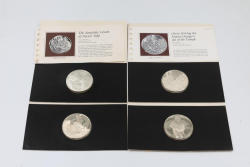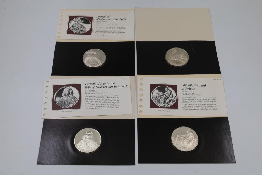 (4) Franklin Mint sterling silver medallions depicting works inspired by Rembrandt, including "Portrait of Nicolaas van Bambeeck", "Portrait of Agatha Bas" and "The Apostle Paul in Prison". Each medallion features etched details with inscriptions on the reverse, presented alongside descriptive inserts. Total weight being 264 grams.