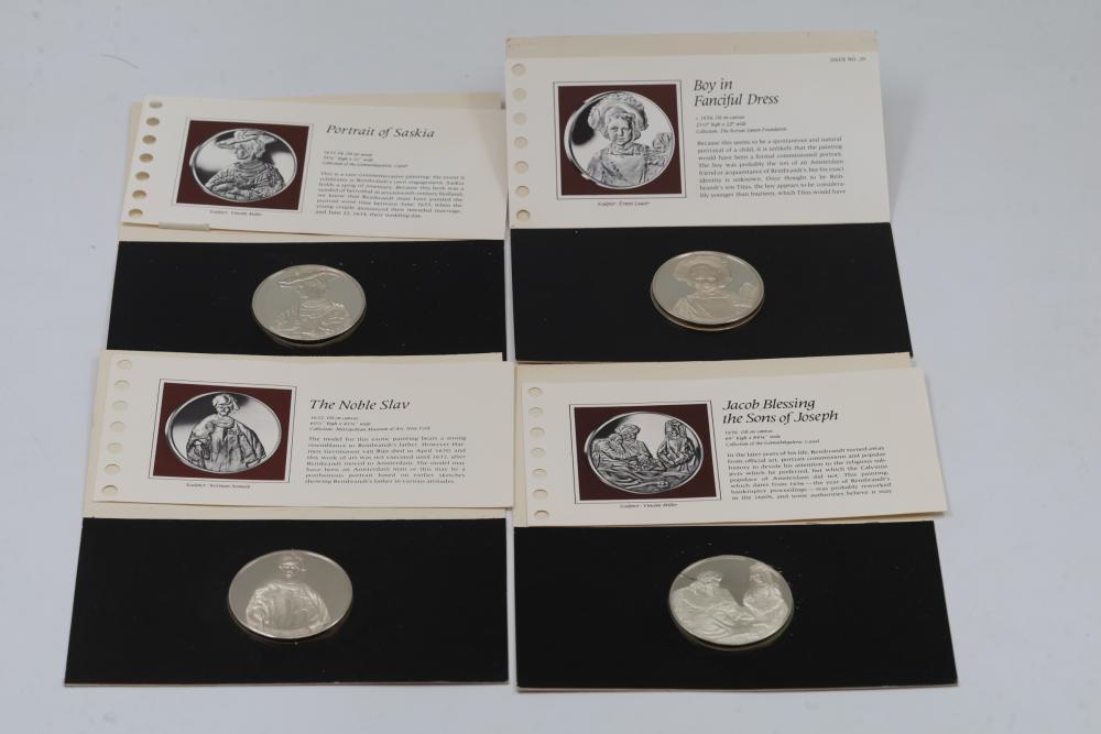 (4) Rembrandt-themed Franklin Mint sterling silver medals, each featuring detailed engravings: "Jacob Blessing the Sons of Joseph", "Boy in Fanciful Dress", "Portrait of Saskia" and "The Noble Slav". Each medal is inscribed on the reverse, accompanied by related booklets containing detailed historical and artistic context. Total weight being 264 grams.